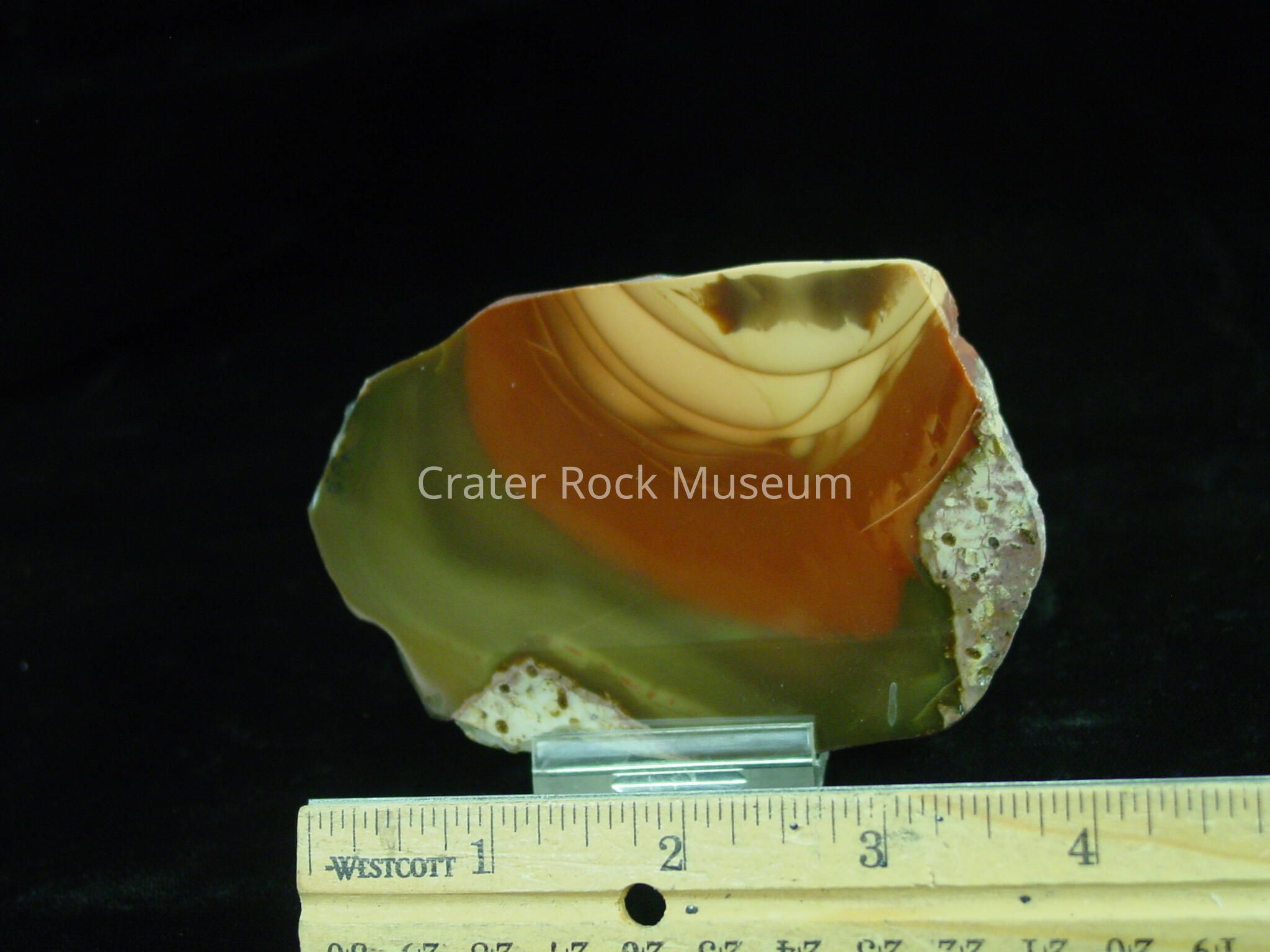 Description: Small thin slab with polished face. Two small areas of dull white and gray with black spots. Orbicular structure throughout remainder with olive green, dark red, and creamy beige toward a common center.