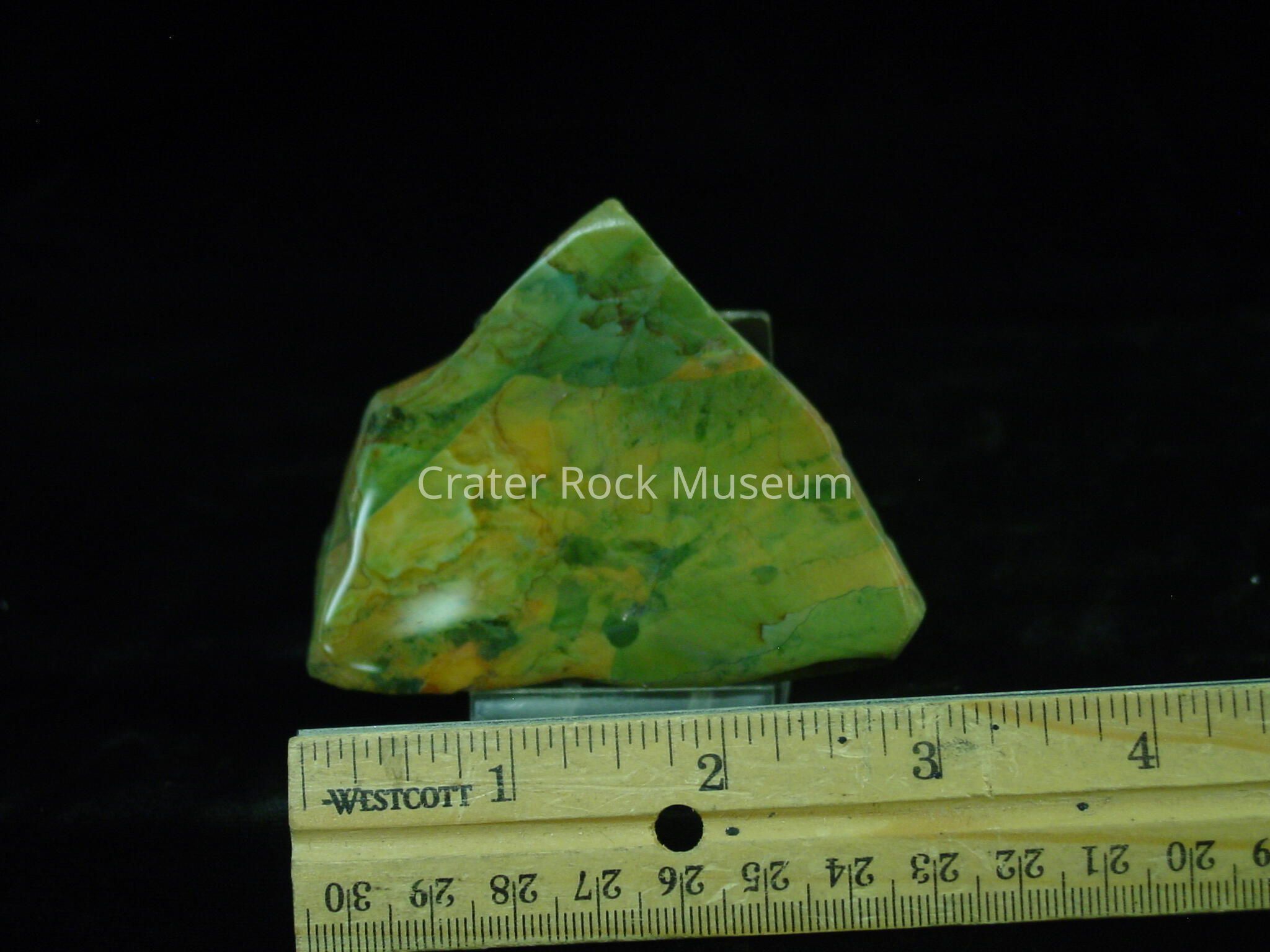 Description: Thin, triangular slab with polished face. Olive green, aqua blues, and various shades of dull yellow to dull orange intermingled in an un-uniform pattern.
