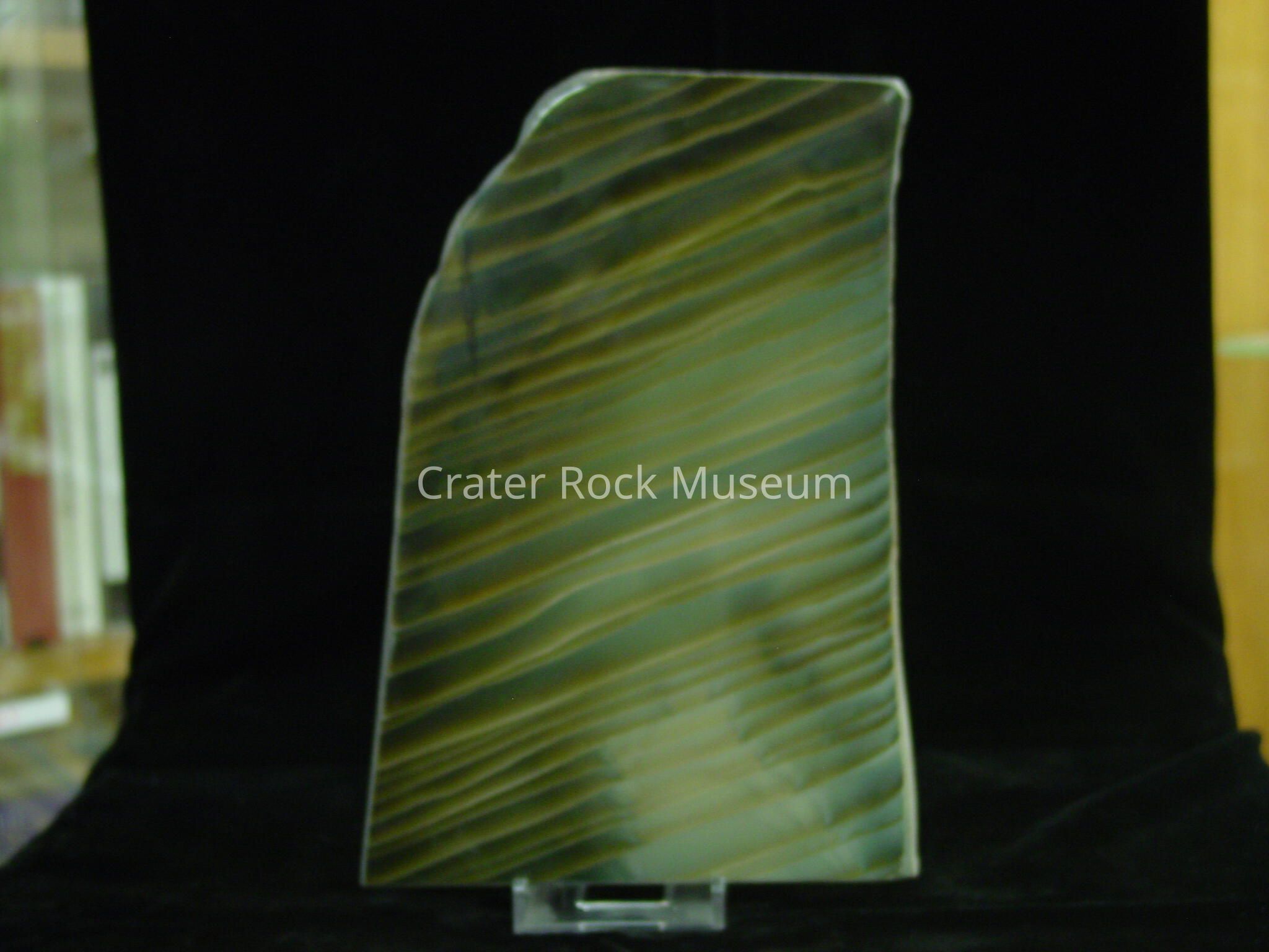 Description: Thin slab with polished face. Linear banding of blue-green to olive green with dull yellow intertwined.