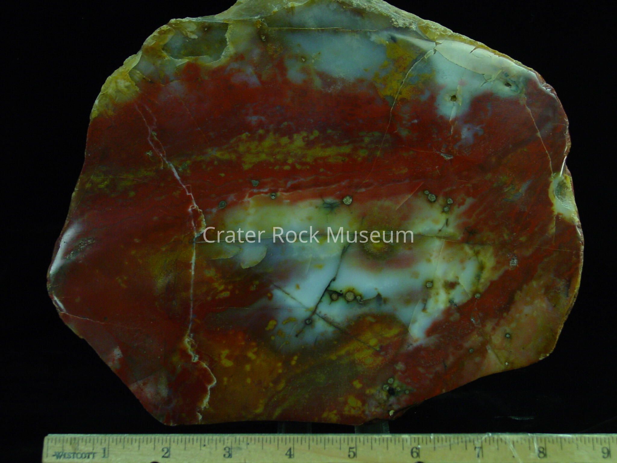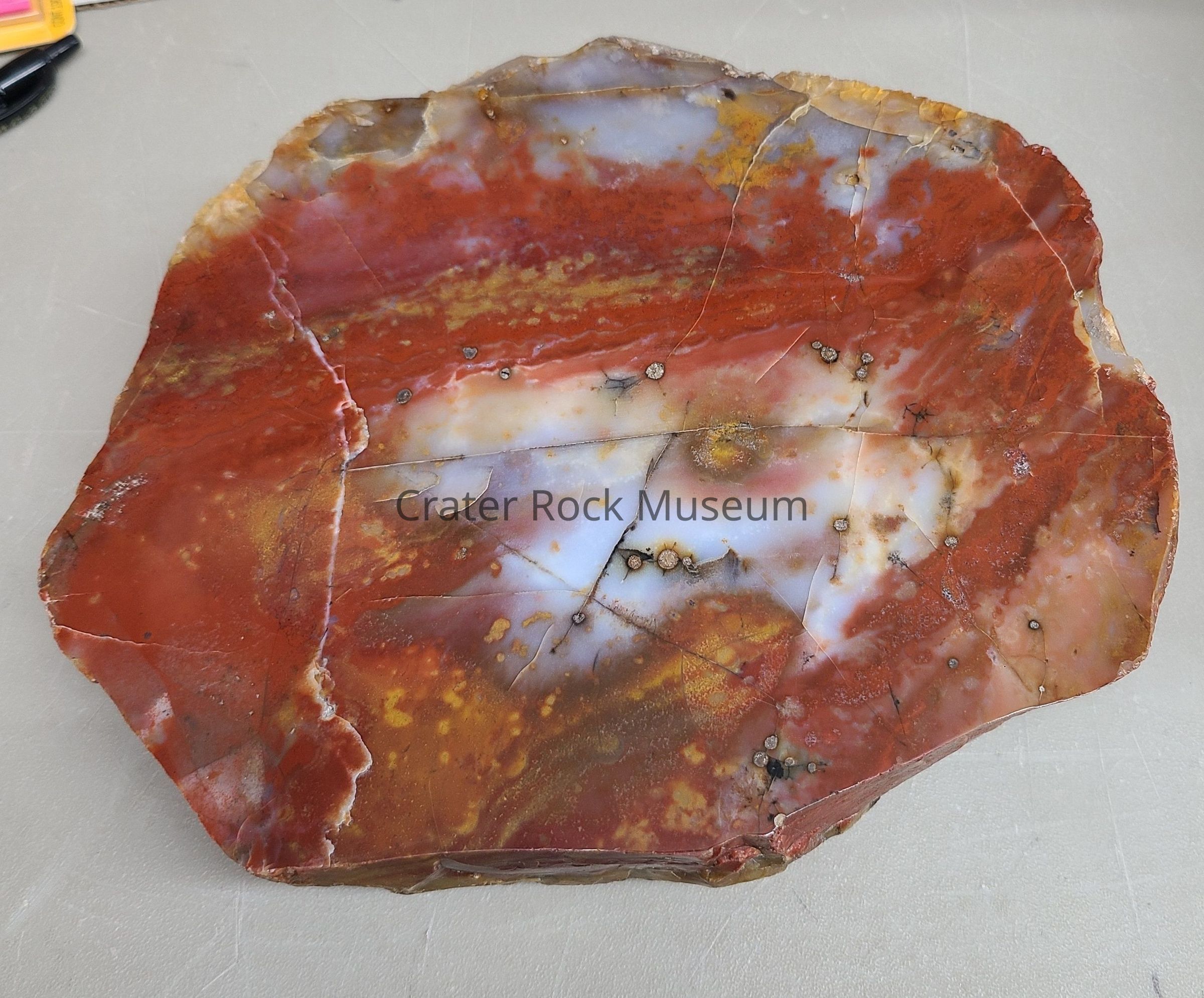 Description: Thick, rounded-back slab with polished face. Reddish-orange covers most areas with some blue-gray.