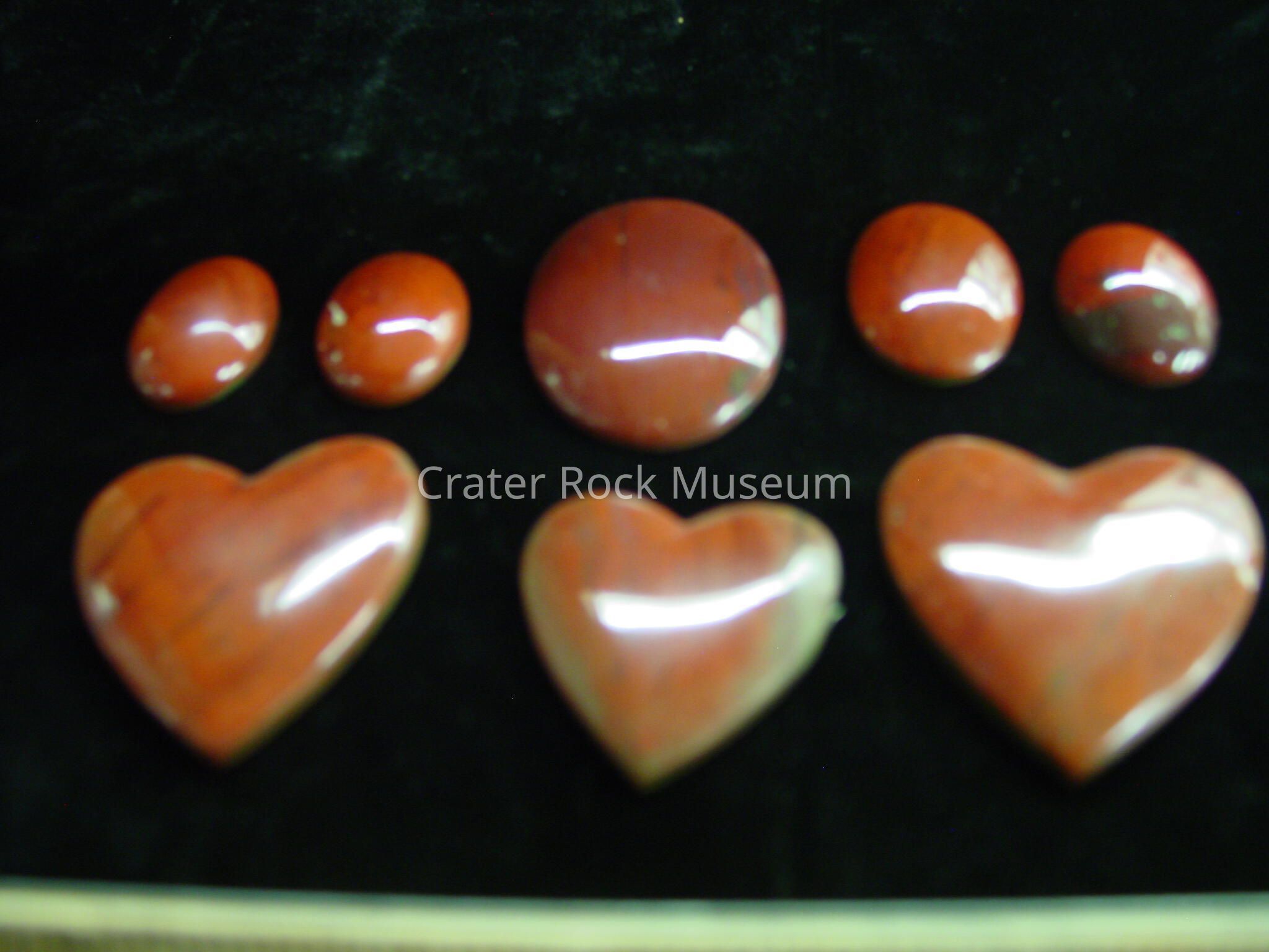 Description: Thin (heart-shape) slice with polished, rounded face. Reddish-brown with slight streaking.