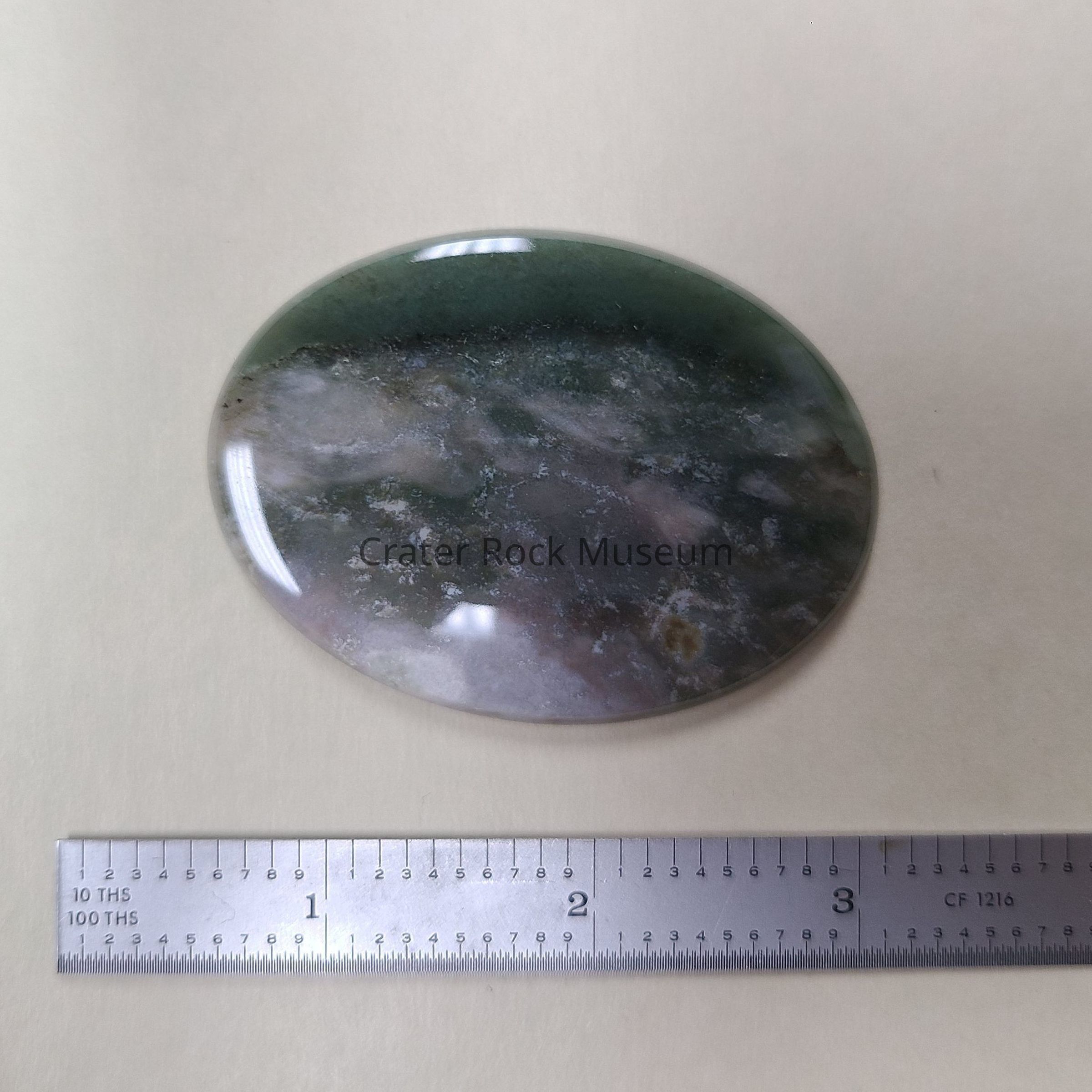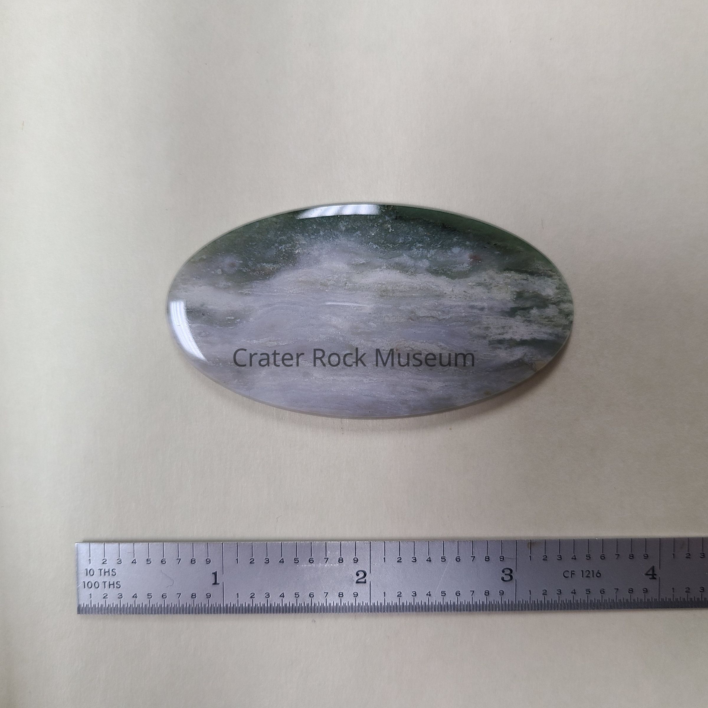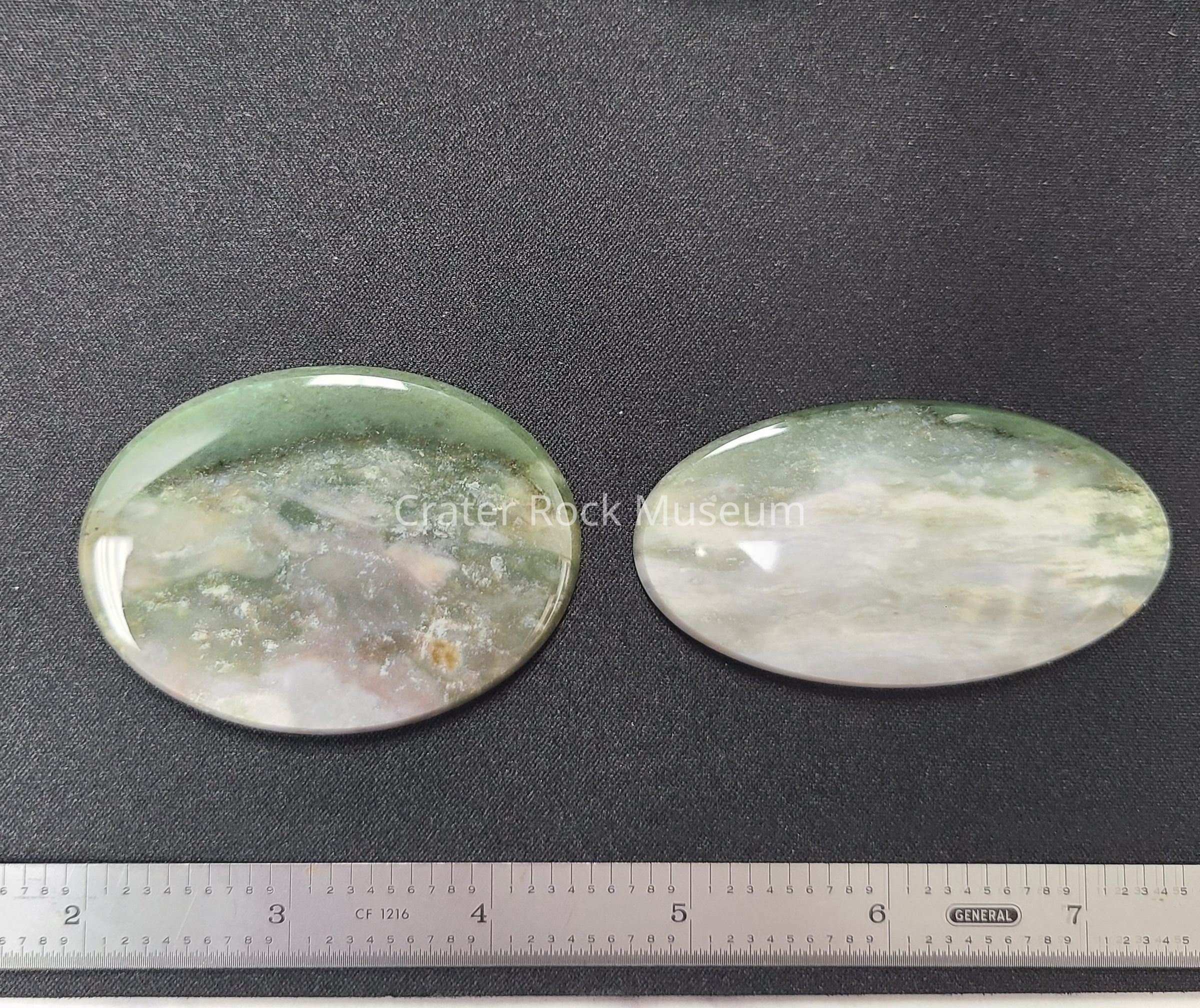 [A] dark green around the upper curve and mix of grey, green, and white throughout, Rounder oval to the left, [B] mostly cloud white tinged green at the edges thinner ellipsis to the right
