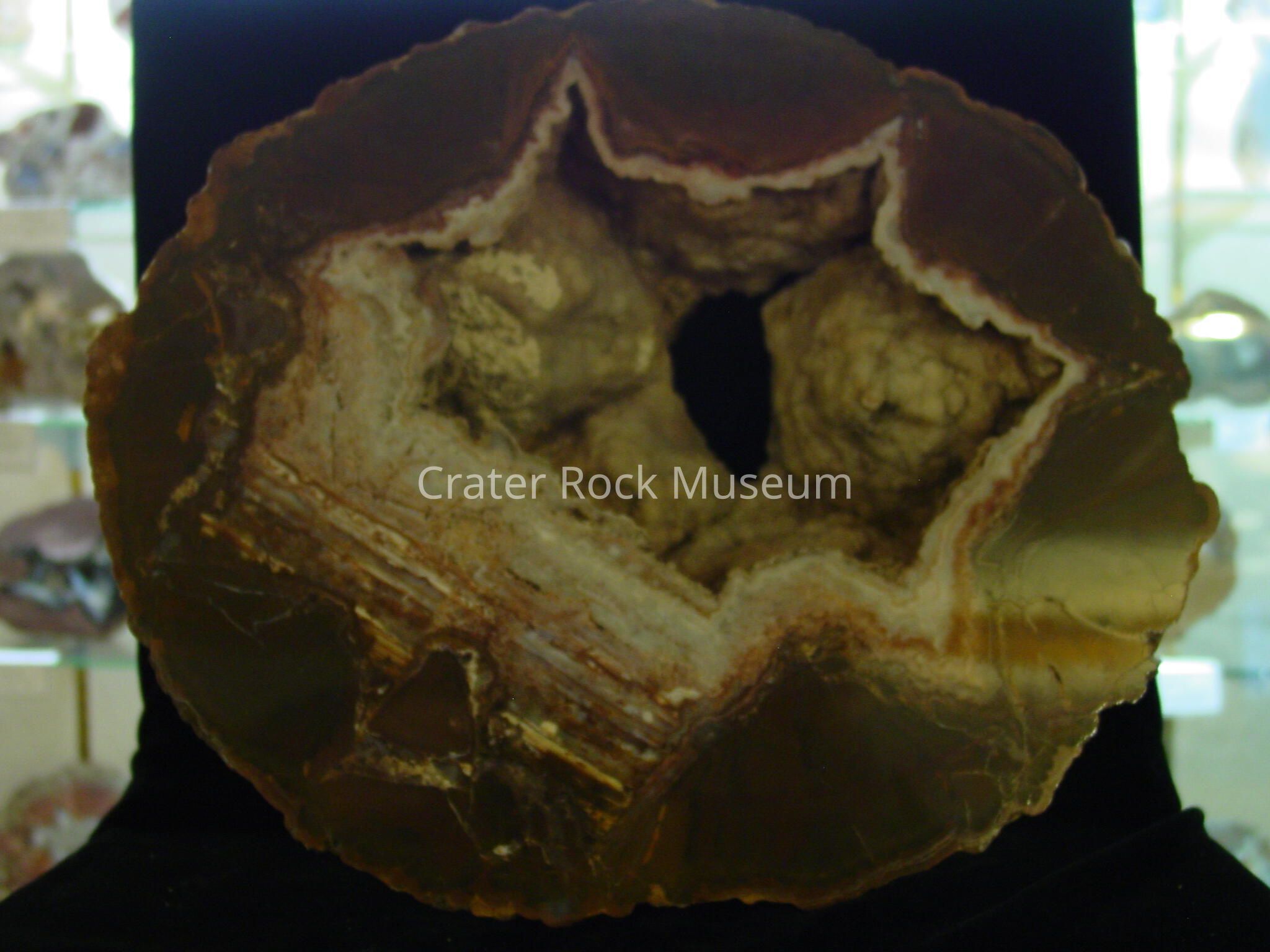 Description: Rough, rounded back with polished face. Solid dark brown on outer areas with a reddish-brown and white outer band surrounding a partial linear banded area of reddish-brown, dull white, and black inner area, and a hollow cavity with a dull gray nodule center inside.Collection