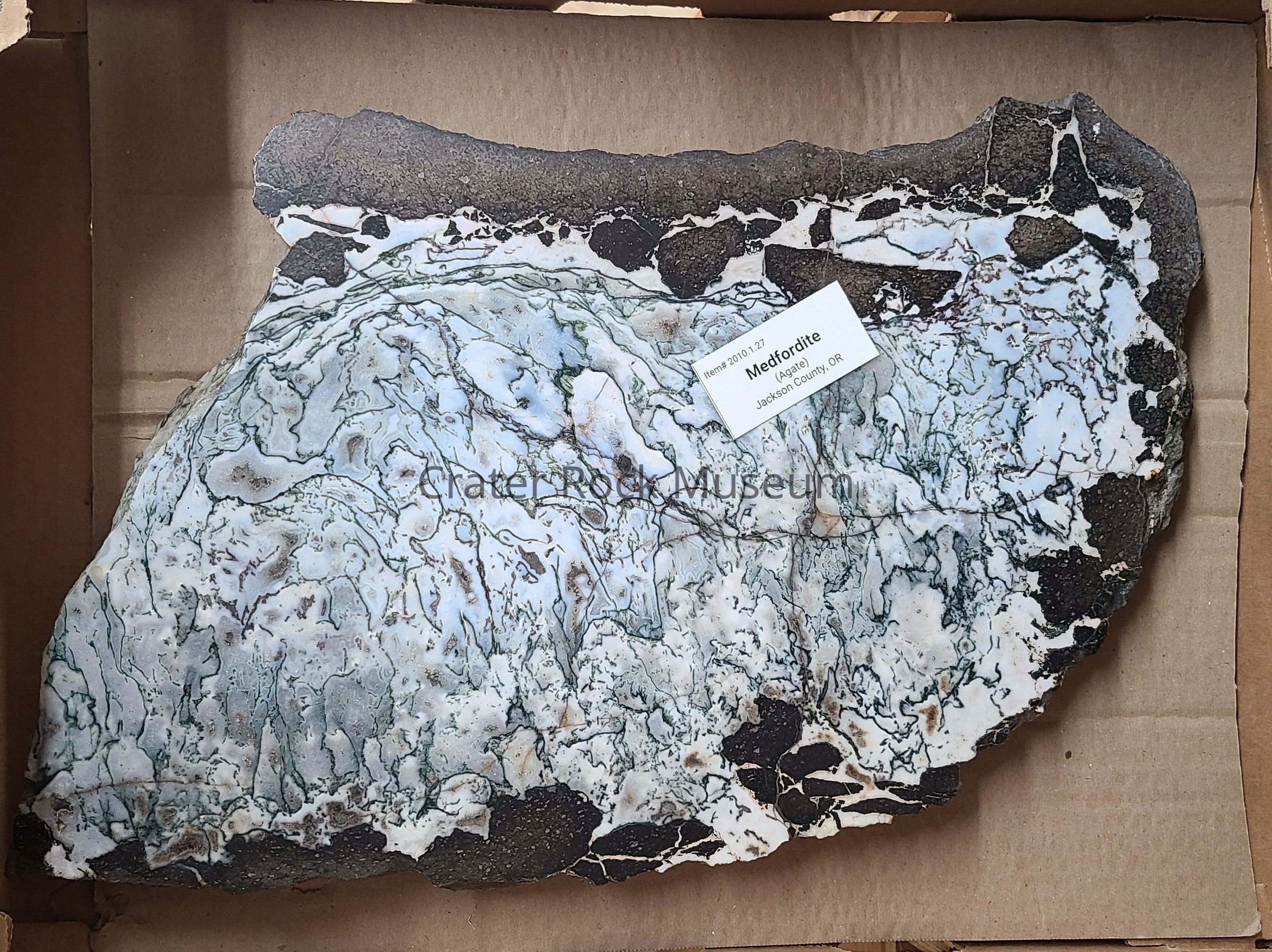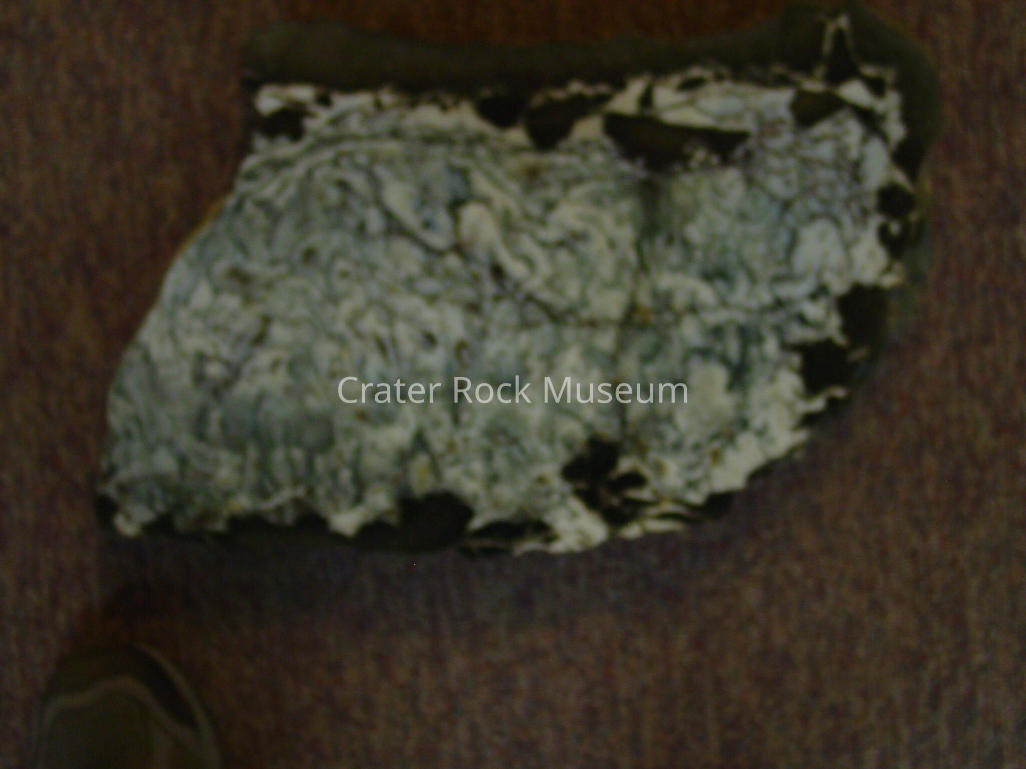 Description: Large, thick, irregular back with polished face. Black and gray spotted outer area with white and light greenish-blue inner area with heavy streaking and some black chambers intermixed throughout border areas.