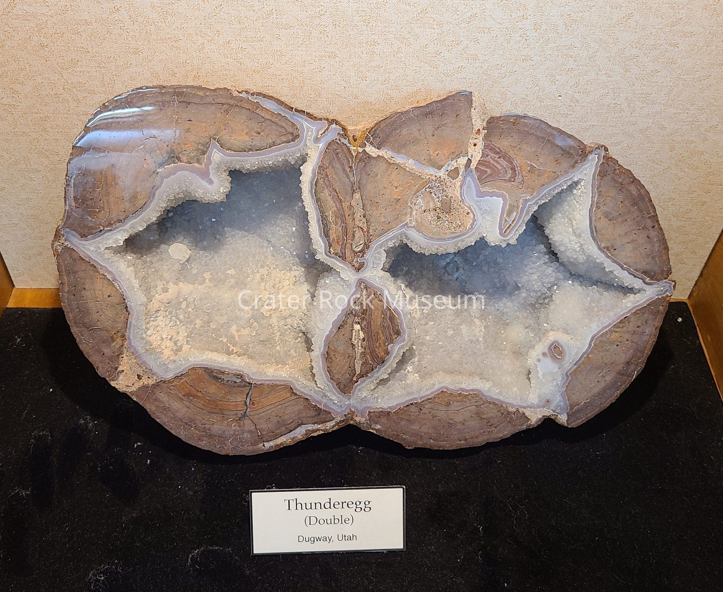 Description: Large, rounded back with polished face. Two spheres with light and dark brown, with light banding on outer areas. A white to blue-gray star-shaped outer band with a hollow cavity with a translucent blue-gray crystalline structure in the center of both spheres.Collection