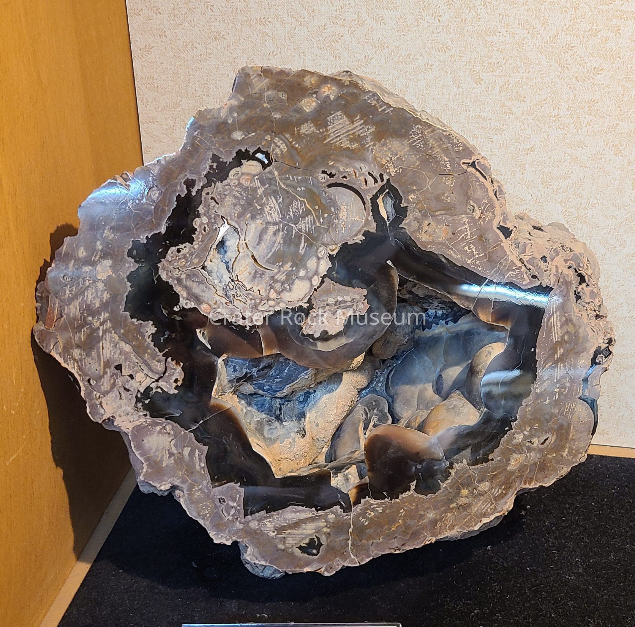 Description: Large, rough, rounded back with polished face. Creamy brown with beige striations and spots on outer area. A thick, black and transparent smoky gray band surrounds a hollow cavity with chalky beige and blue-gray orbs inside.Collection