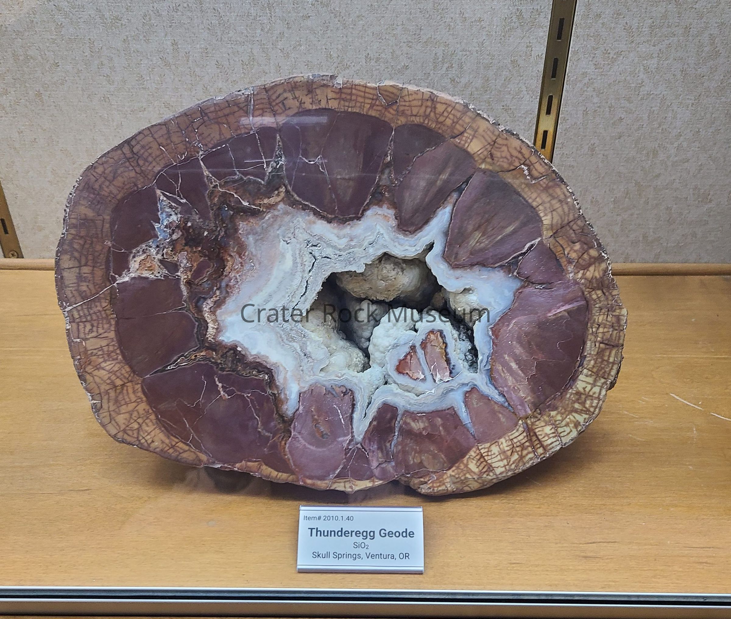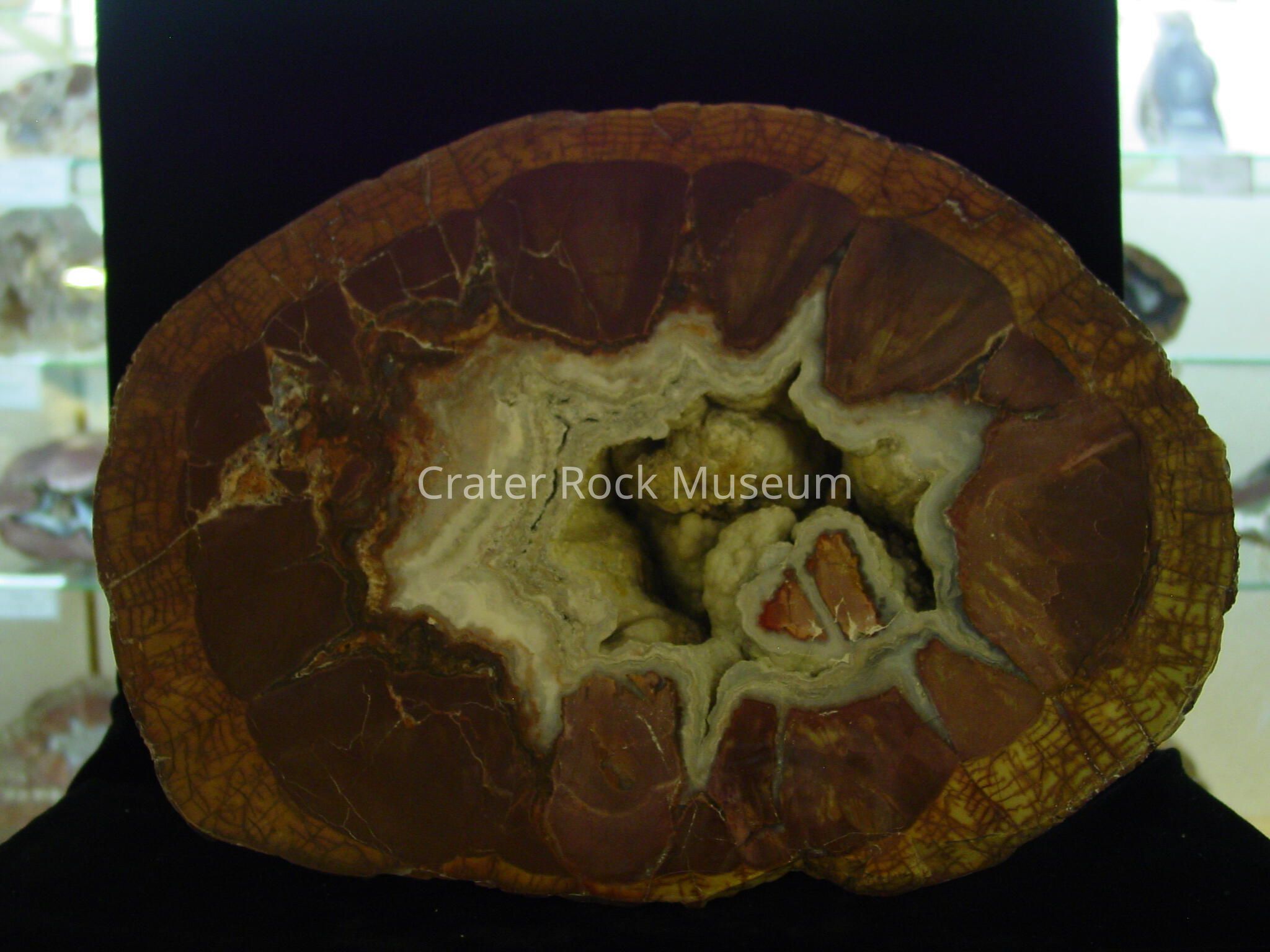 Description: Large, rounded back with polished face. Light brown to beige outer band with symmetrical reddish-brown cracking. The inner area is a solid reddish-brown with a turtle-back appearance. The center is a hollow cavity with blue-gray and chalky-white center surrounded by a white and grainy blue-gray band.Collection