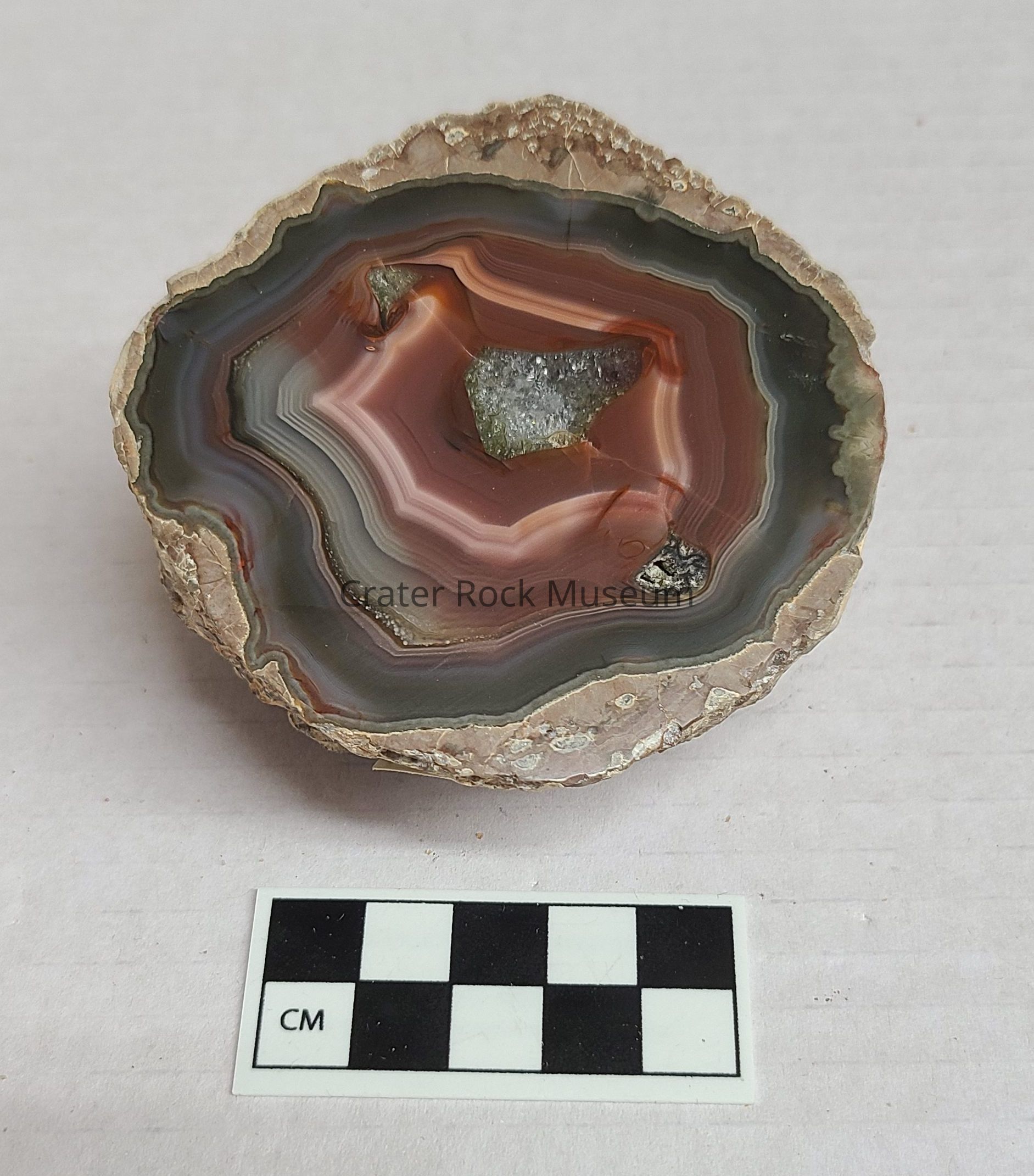 A Thunderegg from the Baker Ranch, Deming, NM. Cut side shows fortified Agate interior in Crystalline (3 spots), Pinks, Reds, Greys and grey Greens. Outer rock is in Pink.Dimensions