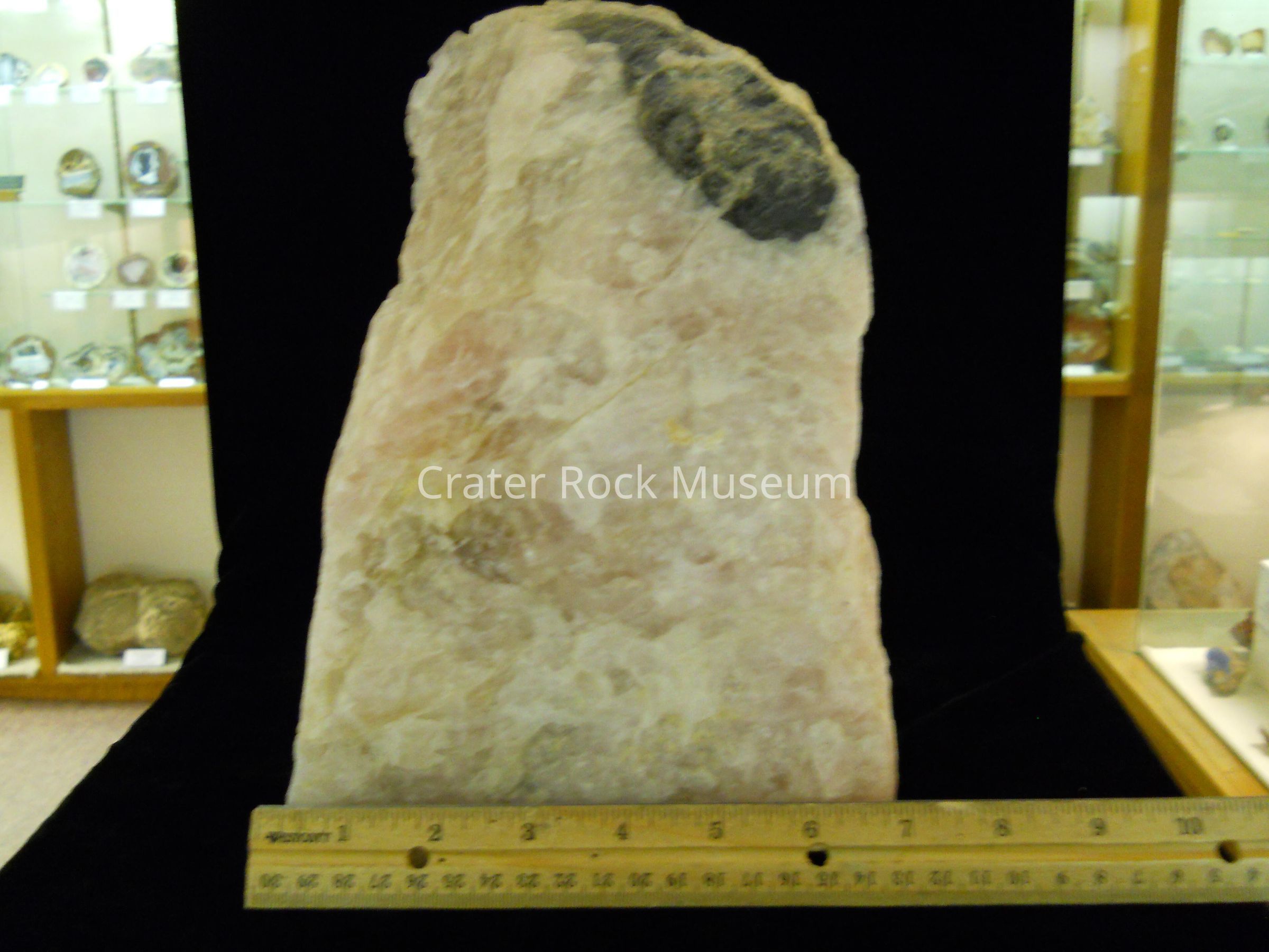 Description: Large, somewhat rectangular. Pinkish-white crystals in a uniform configuration with some cleavage. A black linear crystal with white striations embedded on one side.