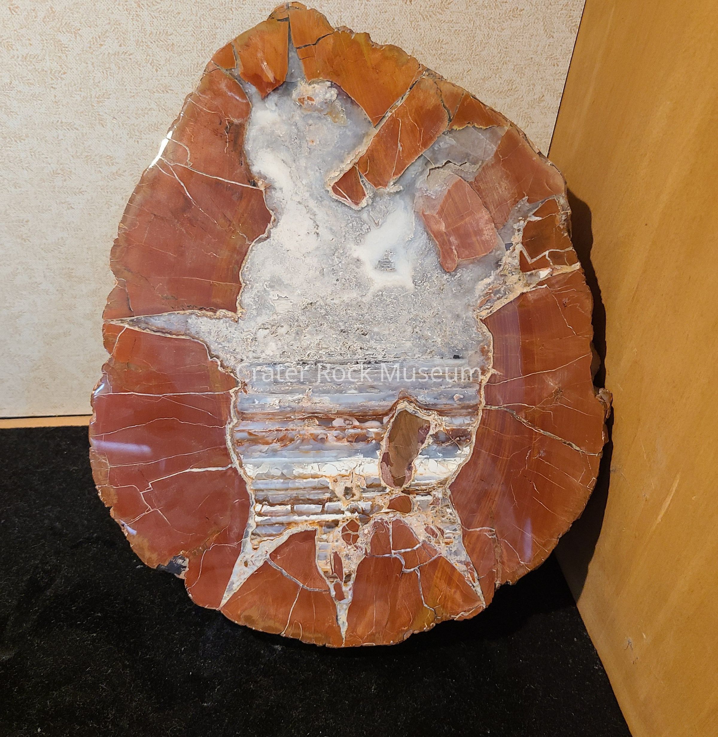 Description: Large, rounded back with polished face. Light and dark reddish-brown with white cracking on outer regions. Inner area is a conglomerate of banded black, blue-grays, white, browns, and an area of grainy tans and whites.Collection