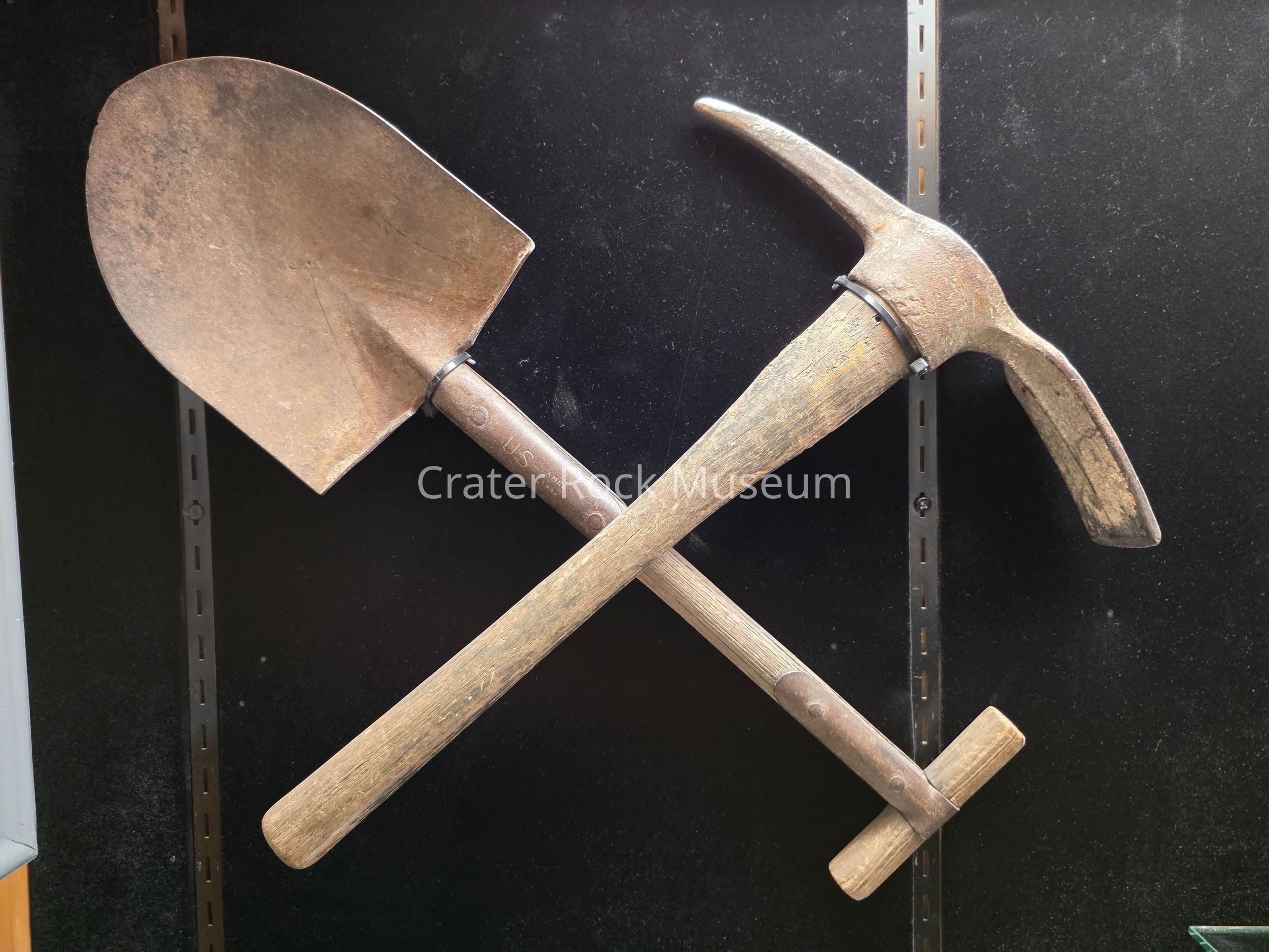 Rusted steel head pick with a wooden handle. Affixed with black zip ties to the back wall of mining case in conjunction with 2025.8.27, which this piece overlaps.