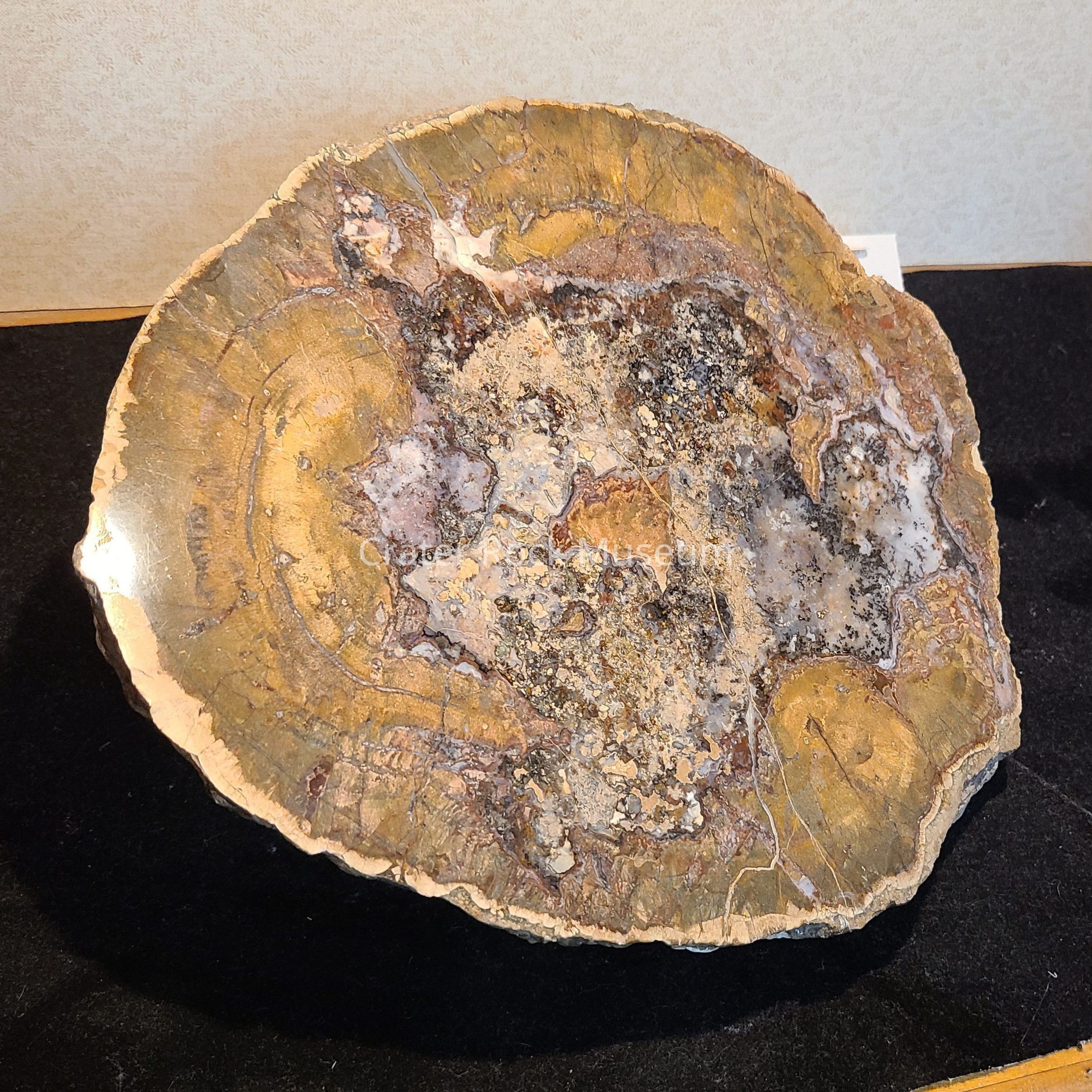 Description: Rounded back with polished face. Thin, tan band on outer edge with olive green and light browns on outer area and a conglomerate of black, blue-grays, tans, and some spots of reddish-brown.Collection