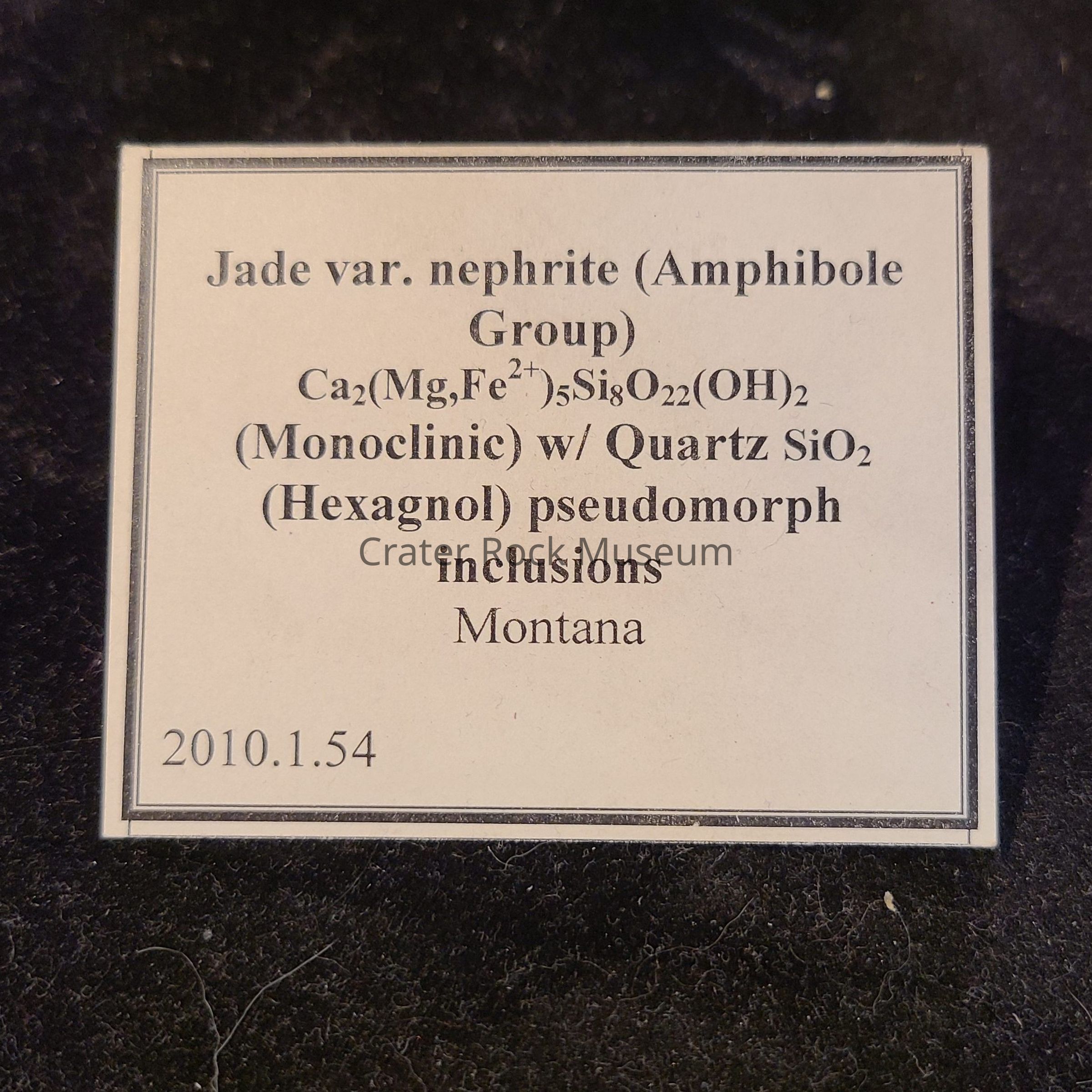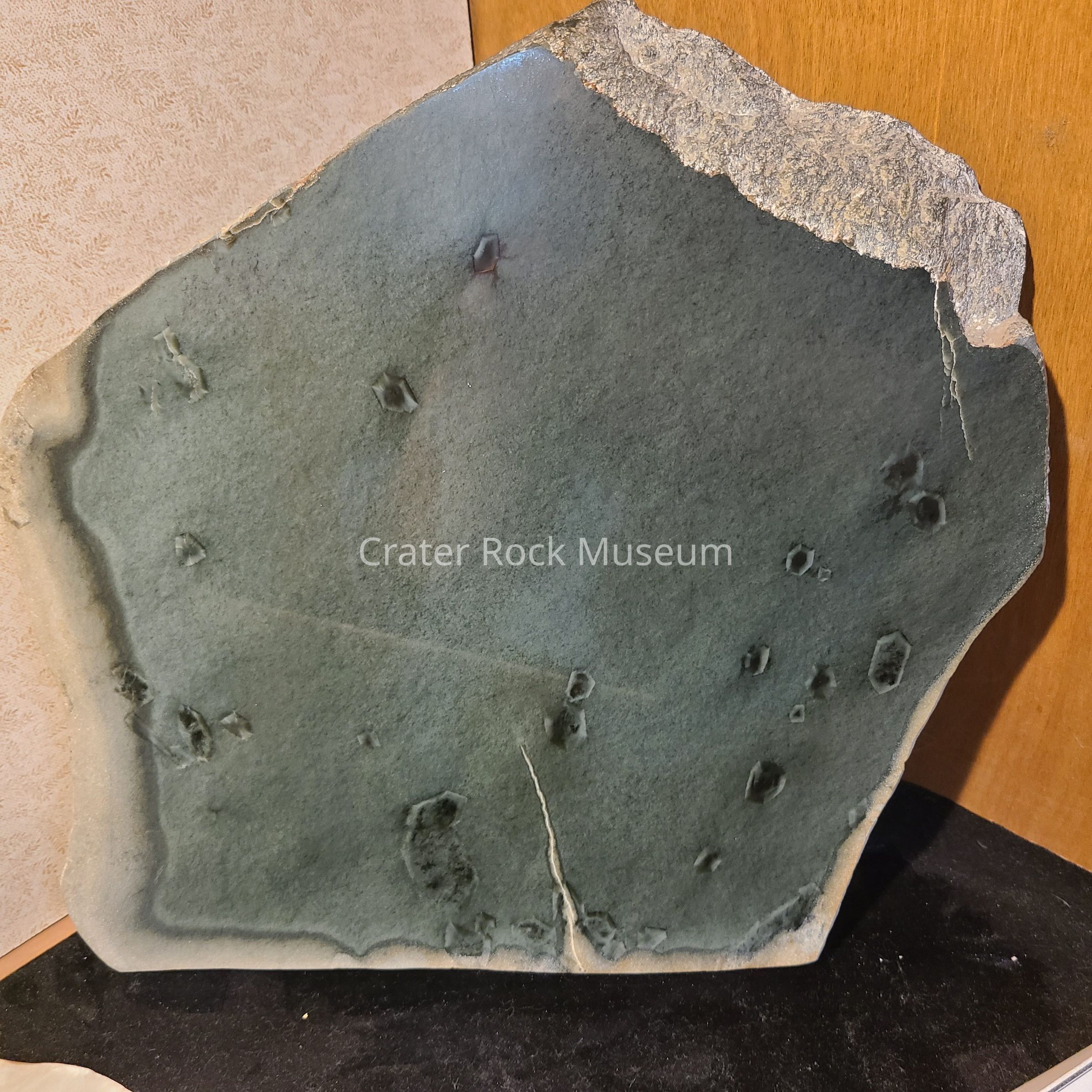 Description: Large block, with six flat sides and one polished face. Dark green with some black streaking and spotting. Some rough, light-brown areas with a grainy texture.Collection