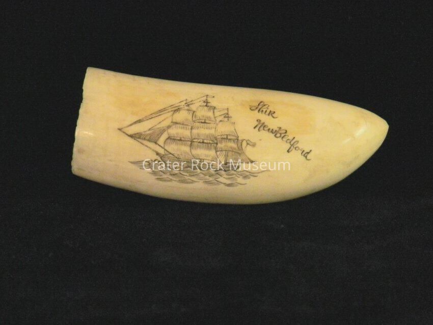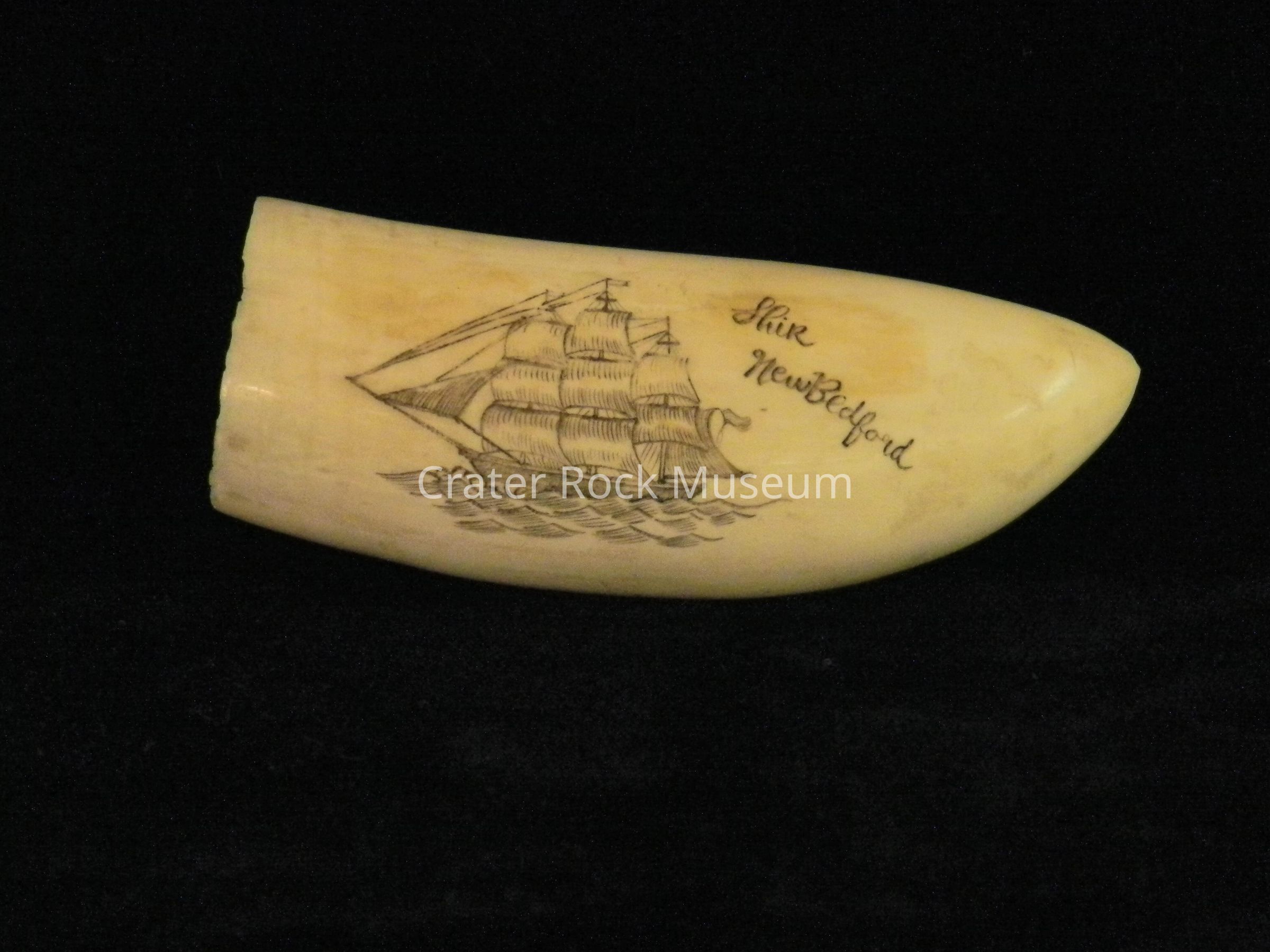 Description: Sperm whale tooth with (2) etched sides. One side has a three-masted schooner with the words "Ship New Bedford" and the other side has a sperm whale with ship in background and a whaling boat in foreground..