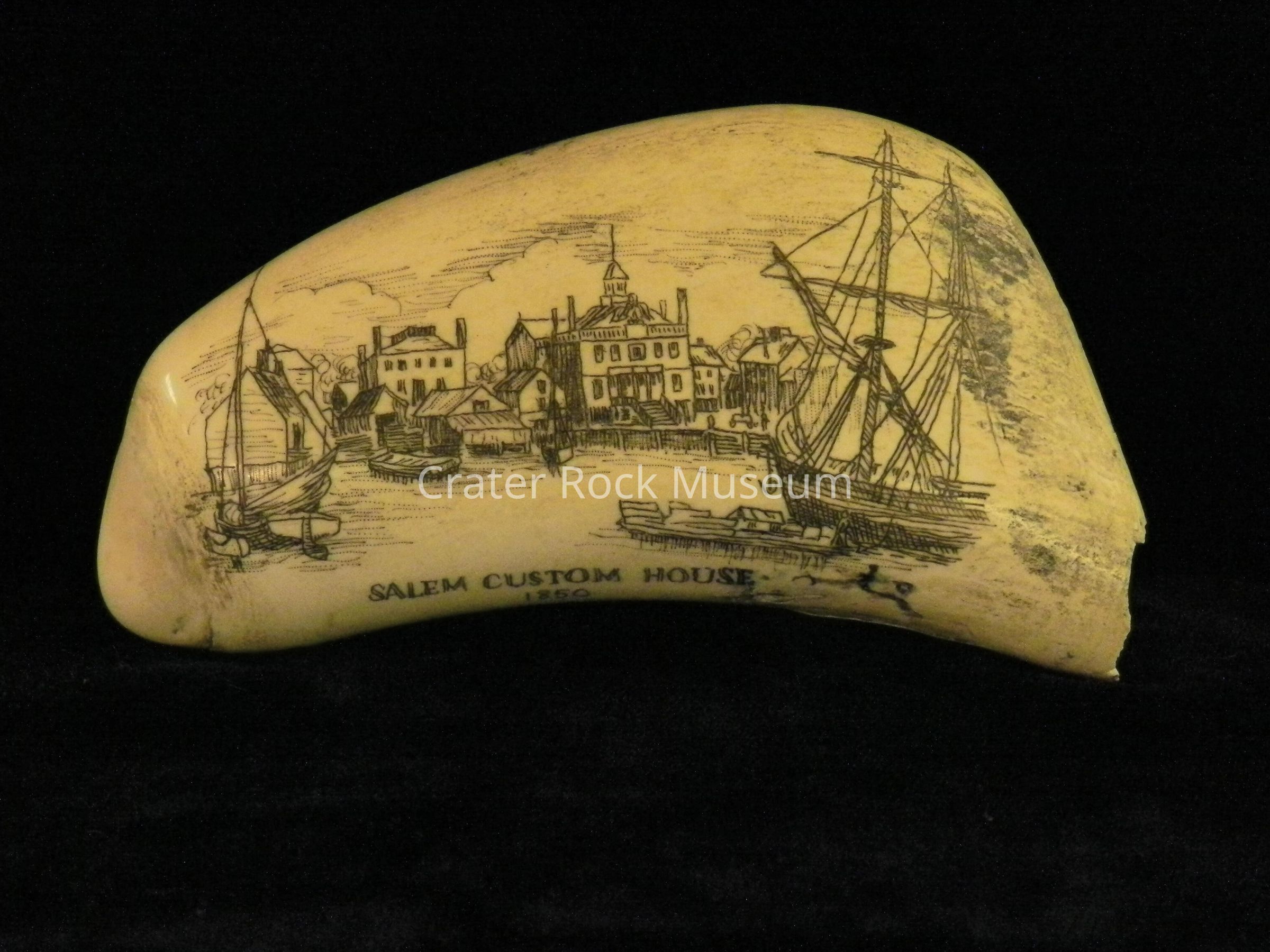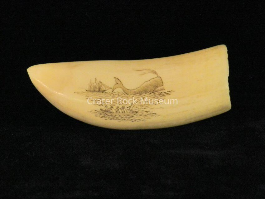 Scrimshaw is the name given to handiwork created by whalers made from the byproducts of harvesting marine mammals. It is most commonly made out of the bones and teeth of sperm whales, the baleen of other whales, and the tusks of walruses. It takes the form of elaborate engravings in the form of pictures and lettering on the surface of the bone or tooth, with the engraving highlighted using a pigment, or, less often, small sculptures made from the same material. However the latter really fall into the categories of ivory carving, for all carved teeth and tusks, or bone carving. The making of scrimshaw began on whaling ships between 1745 to 1759 on the Pacific Ocean, and survived until the ban on commercial whaling. The practice survives as a hobby and as a trade for commercial artisans. A maker of scrimshaw is known as a scrimshander.[1] Scrimshaw is also a surname. The etymology is uncertain, but there have been several proposals.[2Collection