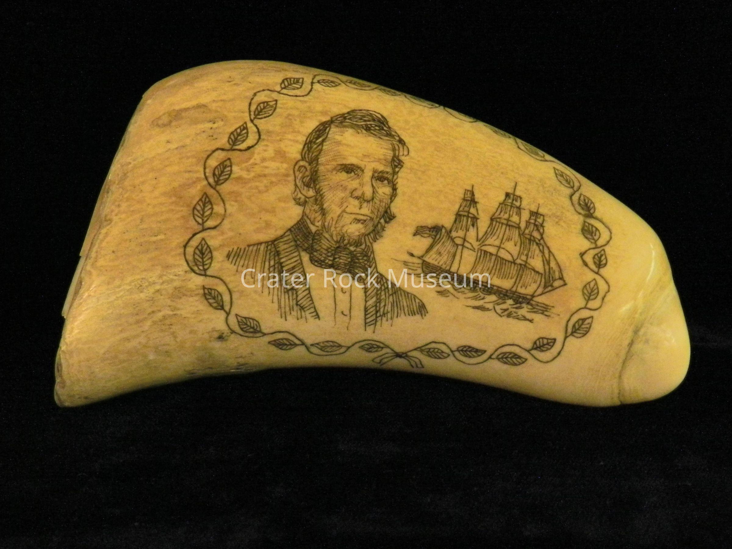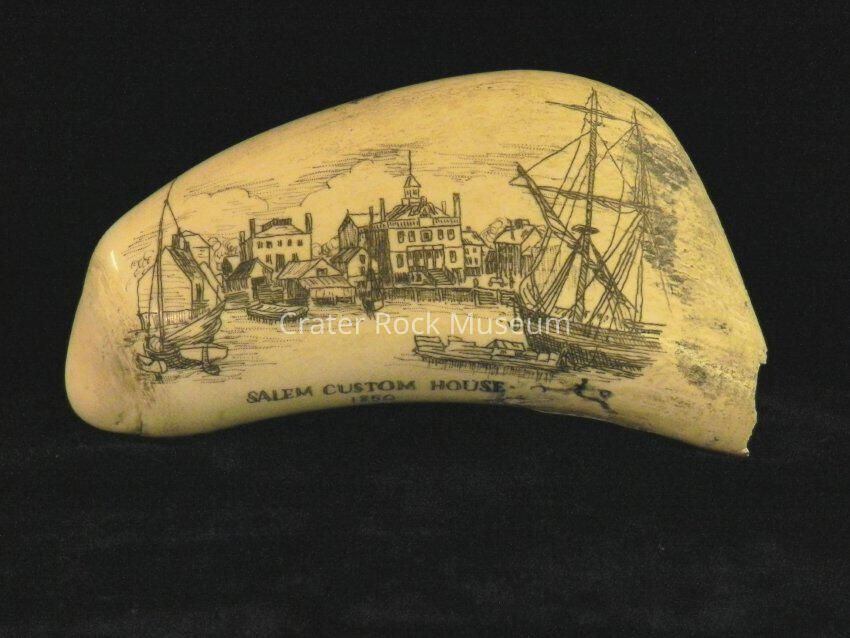 Description: Sperm whale tooth with (2) etched sides. One side shows a harbour with houses and (1) schooner with the words "Salem Custom house-1850"). The other side has a portrait of a slightly bearded man and a three-masted schooner surrounded by a leaf outline.