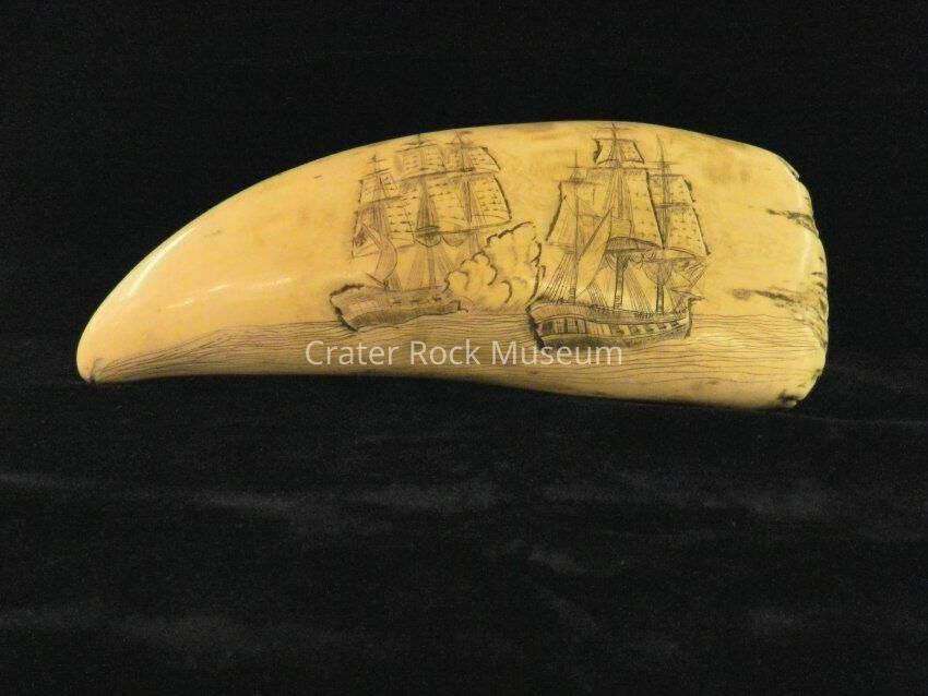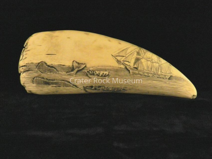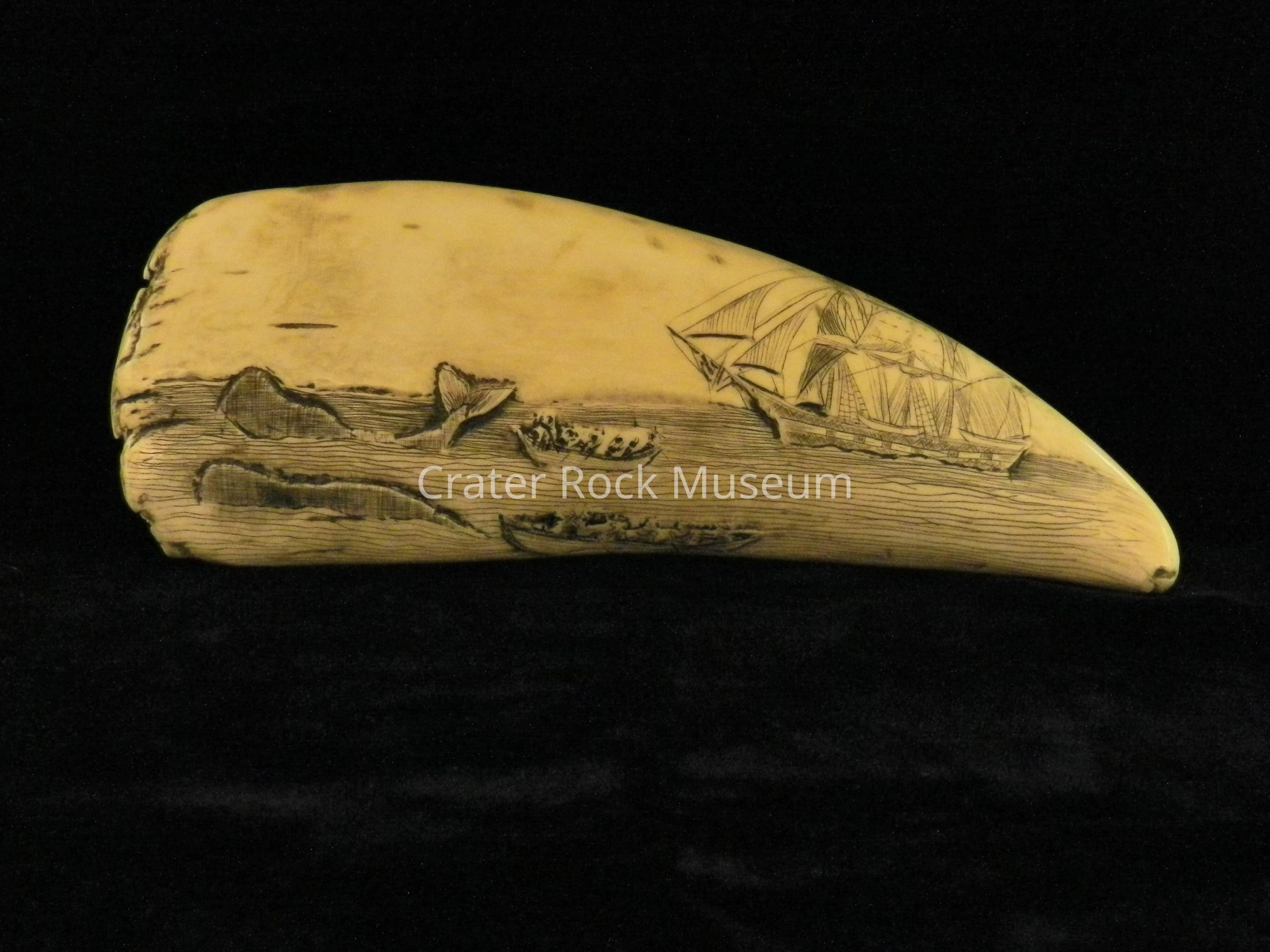 Scrimshaw is the name given to handiwork created by whalers made from the byproducts of harvesting marine mammals. It is most commonly made out of the bones and teeth of sperm whales, the baleen of other whales, and the tusks of walruses. It takes the form of elaborate engravings in the form of pictures and lettering on the surface of the bone or tooth, with the engraving highlighted using a pigment, or, less often, small sculptures made from the same material. However the latter really fall into the categories of ivory carving, for all carved teeth and tusks, or bone carving. The making of scrimshaw began on whaling ships between 1745 to 1759 on the Pacific Ocean, and survived until the ban on commercial whaling. The practice survives as a hobby and as a trade for commercial artisans. A maker of scrimshaw is known as a scrimshander.[1] Scrimshaw is also a surname. The etymology is uncertain, but there have been several proposals.[2Collection
