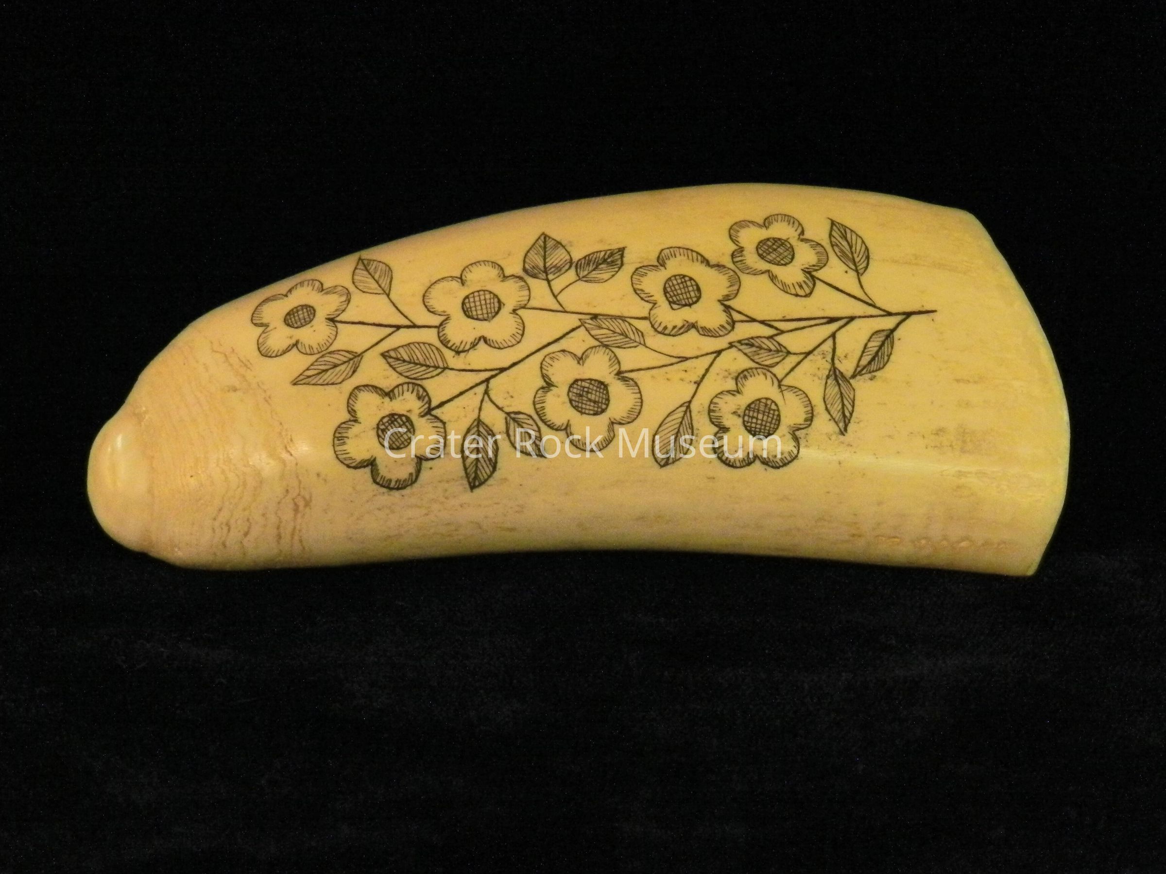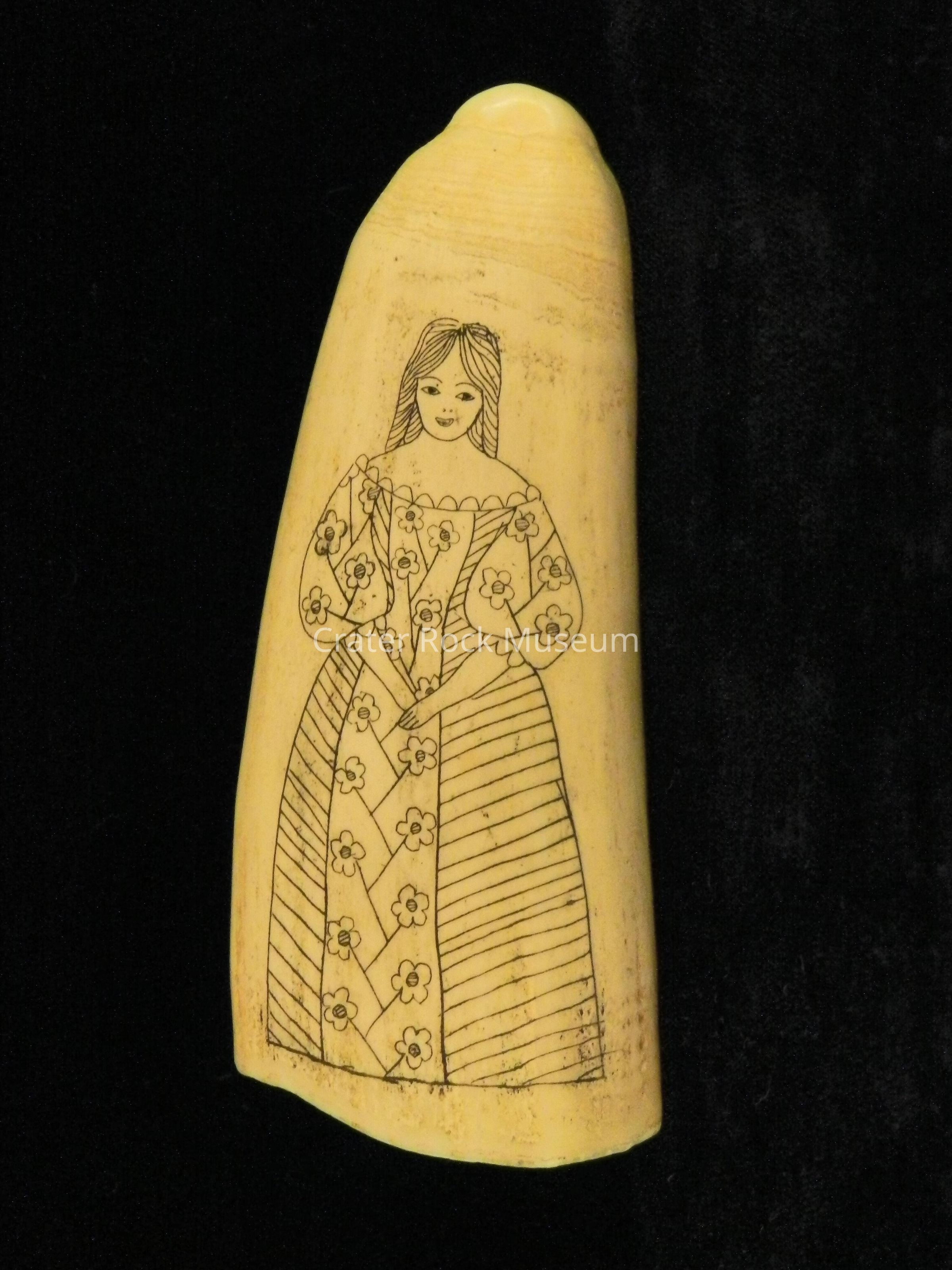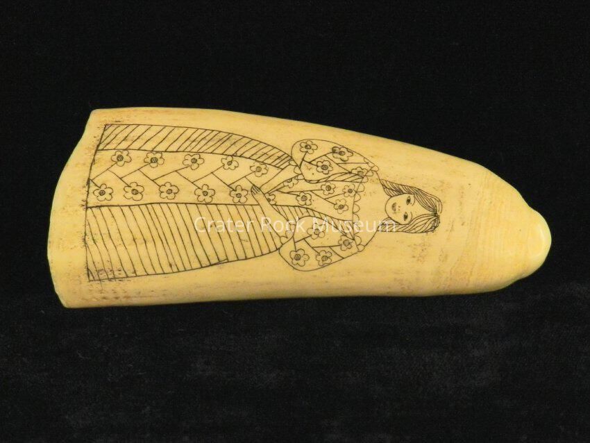 Description: Small whales tooth with etching on (2) sides. One side has a woman in a long dress and the other side has a floral pattern.