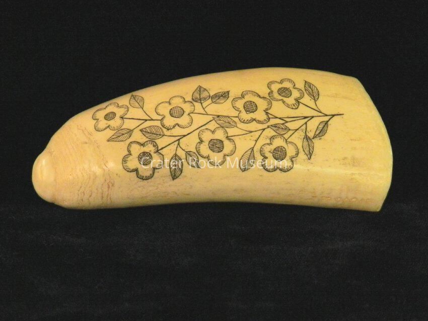 Scrimshaw is the name given to handiwork created by whalers made from the byproducts of harvesting marine mammals. It is most commonly made out of the bones and teeth of sperm whales, the baleen of other whales, and the tusks of walruses. It takes the form of elaborate engravings in the form of pictures and lettering on the surface of the bone or tooth, with the engraving highlighted using a pigment, or, less often, small sculptures made from the same material. However the latter really fall into the categories of ivory carving, for all carved teeth and tusks, or bone carving. The making of scrimshaw began on whaling ships between 1745 to 1759 on the Pacific Ocean, and survived until the ban on commercial whaling. The practice survives as a hobby and as a trade for commercial artisans. A maker of scrimshaw is known as a scrimshander.[1] Scrimshaw is also a surname. The etymology is uncertain, but there have been several proposals.[2Collection