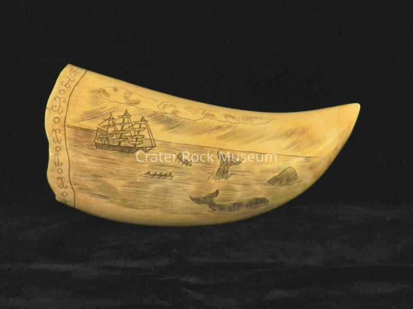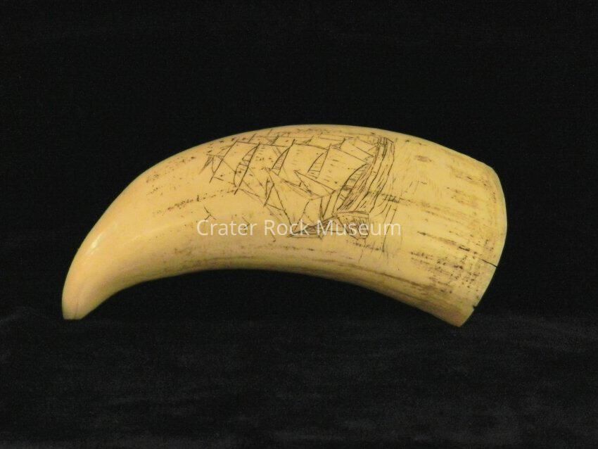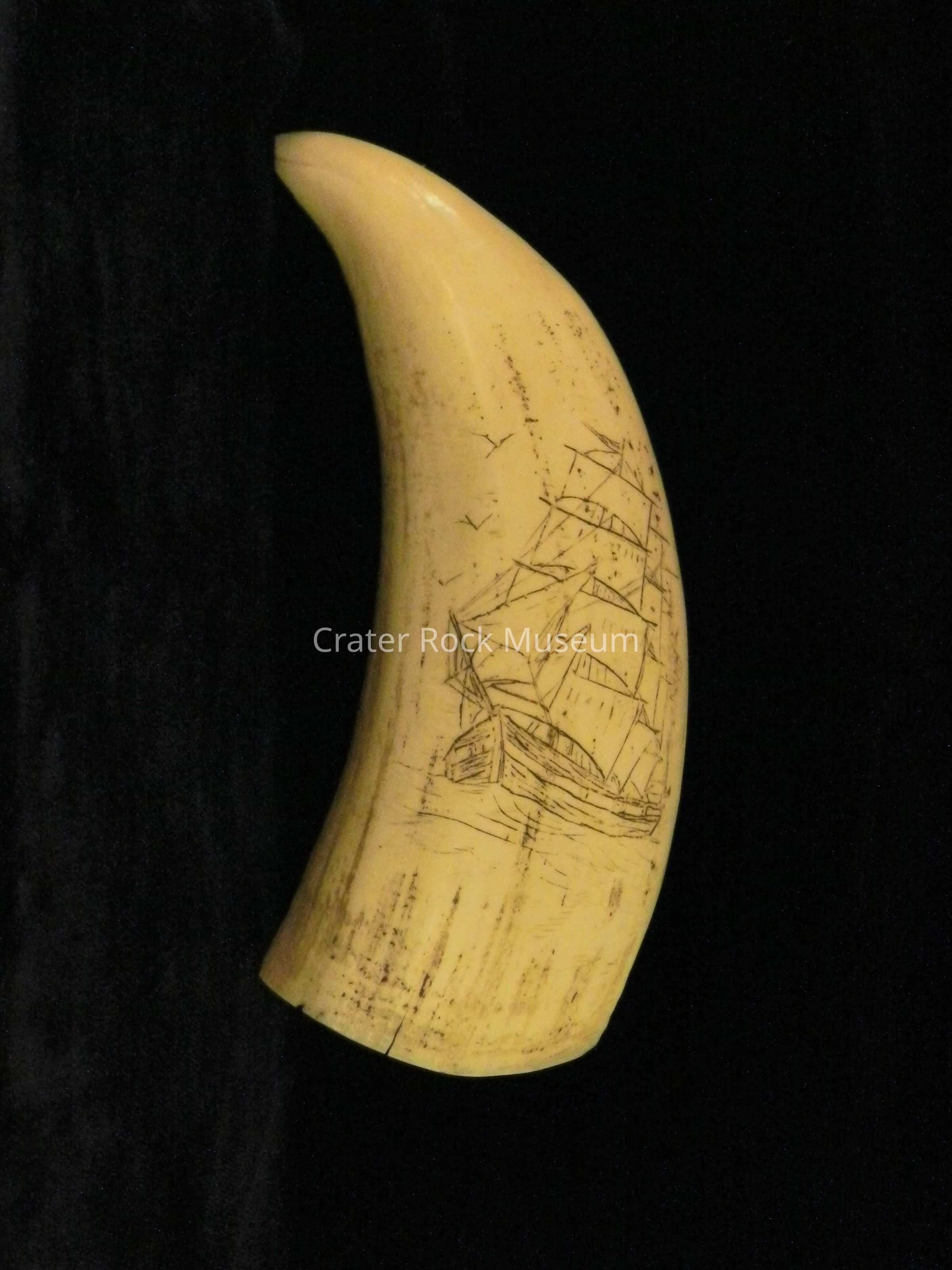 Description: Sperm whale tooth, with (1) etched side showing an outline of a three-masted schooner.