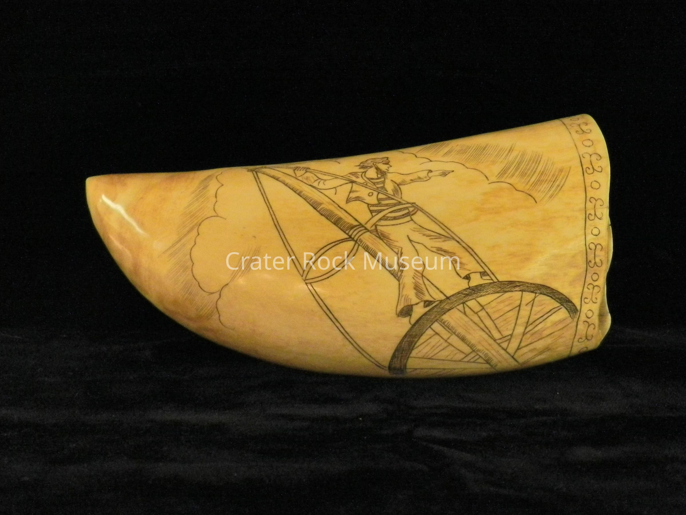 Scrimshaw is the name given to handiwork created by whalers made from the byproducts of harvesting marine mammals. It is most commonly made out of the bones and teeth of sperm whales, the baleen of other whales, and the tusks of walruses. It takes the form of elaborate engravings in the form of pictures and lettering on the surface of the bone or tooth, with the engraving highlighted using a pigment, or, less often, small sculptures made from the same material. However the latter really fall into the categories of ivory carving, for all carved teeth and tusks, or bone carving. The making of scrimshaw began on whaling ships between 1745 to 1759 on the Pacific Ocean, and survived until the ban on commercial whaling. The practice survives as a hobby and as a trade for commercial artisans. A maker of scrimshaw is known as a scrimshander.[1] Scrimshaw is also a surname. The etymology is uncertain, but there have been several proposals.[2Collection