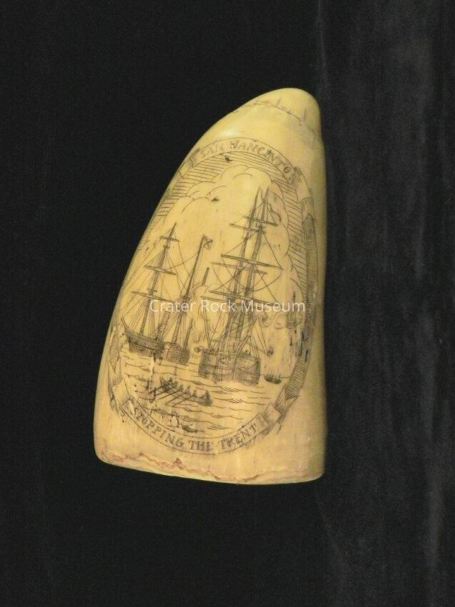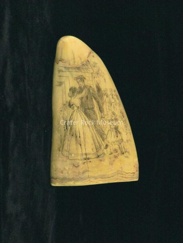 Description: Sperm whale tooth, etched on two sides. One side shows two steam sailing ships with (1) whaling boat inside a decorative oval. Has the words "San Jacinto" on top and "Stopping the Trent" on the bottom. The other side shows a man and woman in dress with a child, and sailors in the background.
