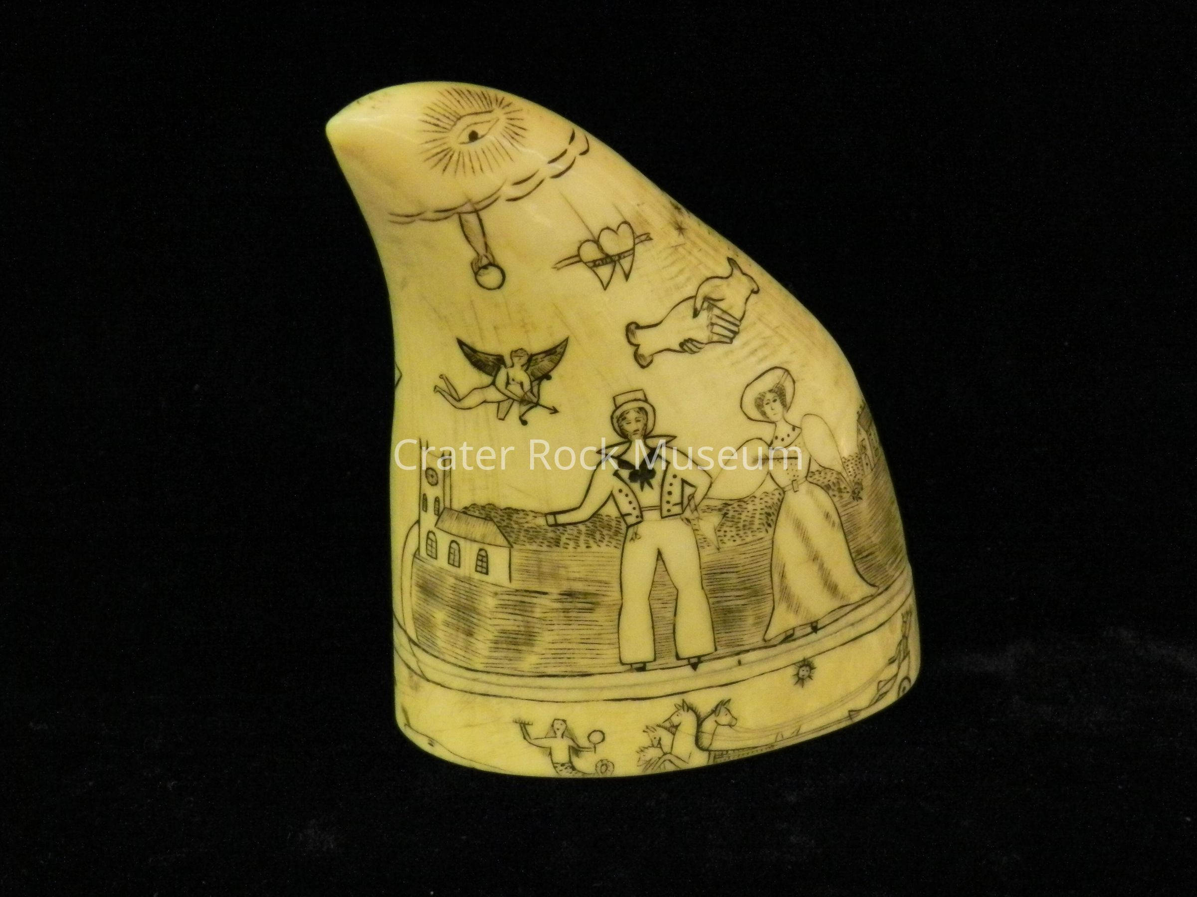 Description: Sperm whale tooth used as the ship's stamp (seal). Etched on all sides with circular metal stamp (0.675 in) on bottom. The etchings contain multiple designs and symbols to include a sailor and woman, a port town, angels, hearts, an all-seeing eye, two hands shaking, a bird, an alligator consuming a man, and a ship. The bottom has the words "Happy Jack" and "The Happy Return".