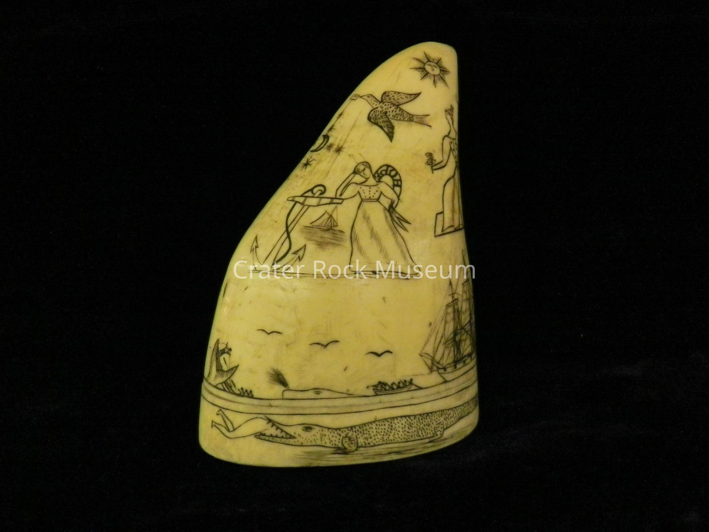 Scrimshaw is the name given to handiwork created by whalers made from the byproducts of harvesting marine mammals. It is most commonly made out of the bones and teeth of sperm whales, the baleen of other whales, and the tusks of walruses. It takes the form of elaborate engravings in the form of pictures and lettering on the surface of the bone or tooth, with the engraving highlighted using a pigment, or, less often, small sculptures made from the same material. However the latter really fall into the categories of ivory carving, for all carved teeth and tusks, or bone carving. The making of scrimshaw began on whaling ships between 1745 to 1759 on the Pacific Ocean, and survived until the ban on commercial whaling. The practice survives as a hobby and as a trade for commercial artisans. A maker of scrimshaw is known as a scrimshander.[1] Scrimshaw is also a surname. The etymology is uncertain, but there have been several proposals.[2Collection