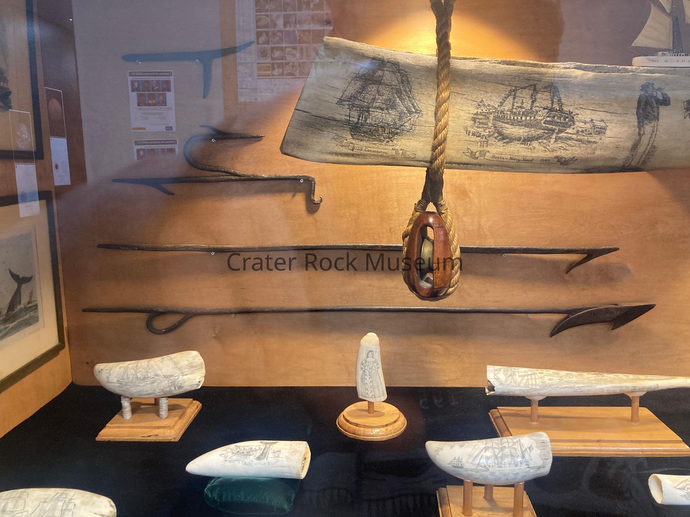 Scrimshaw is the name given to handiwork created by whalers made from the byproducts of harvesting marine mammals. It is most commonly made out of the bones and teeth of sperm whales, the baleen of other whales, and the tusks of walruses. It takes the form of elaborate engravings in the form of pictures and lettering on the surface of the bone or tooth, with the engraving highlighted using a pigment, or, less often, small sculptures made from the same material. However the latter really fall into the categories of ivory carving, for all carved teeth and tusks, or bone carving. The making of scrimshaw began on whaling ships between 1745 to 1759 on the Pacific Ocean, and survived until the ban on commercial whaling. The practice survives as a hobby and as a trade for commercial artisans. A maker of scrimshaw is known as a scrimshander.[1] Scrimshaw is also a surname. The etymology is uncertain, but there have been several proposals.[2]Collection