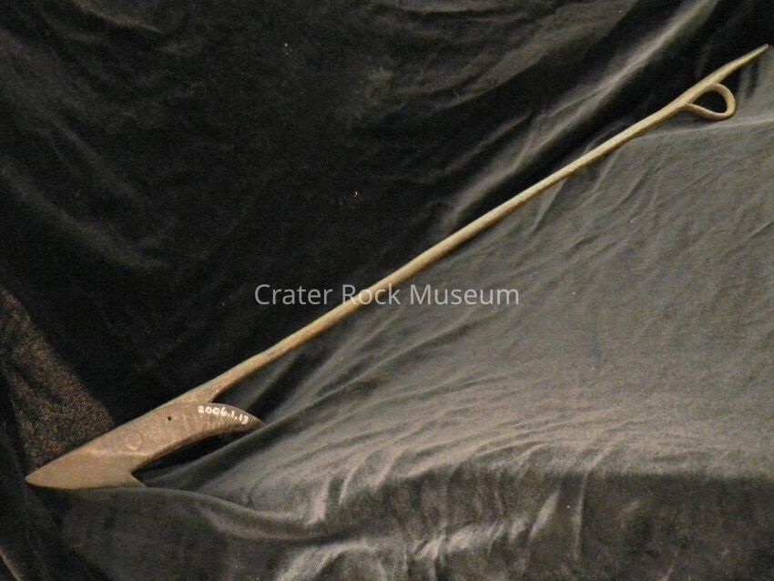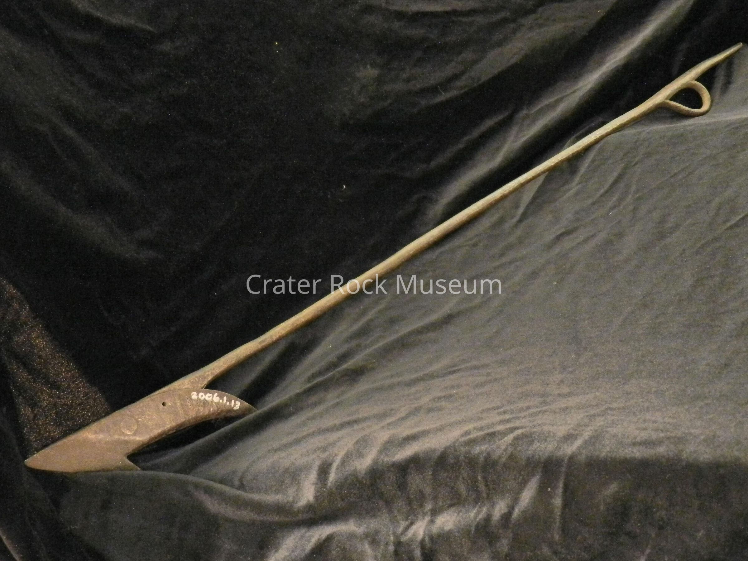 Description: Long, forged harpoon for hunting whales. One end is pointed, with a barb. The other end has a point with a loop (eye).