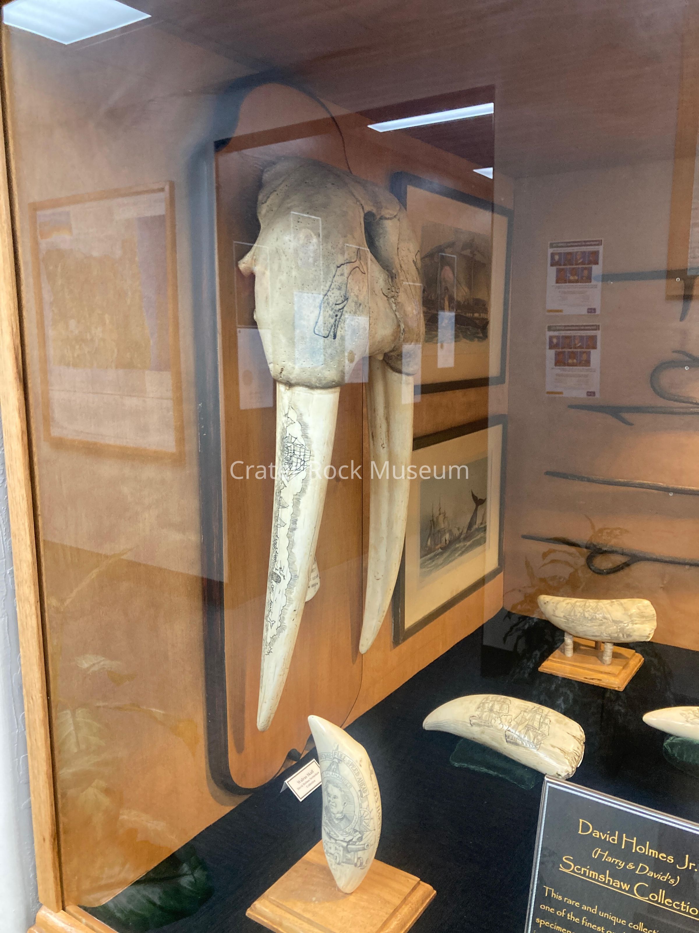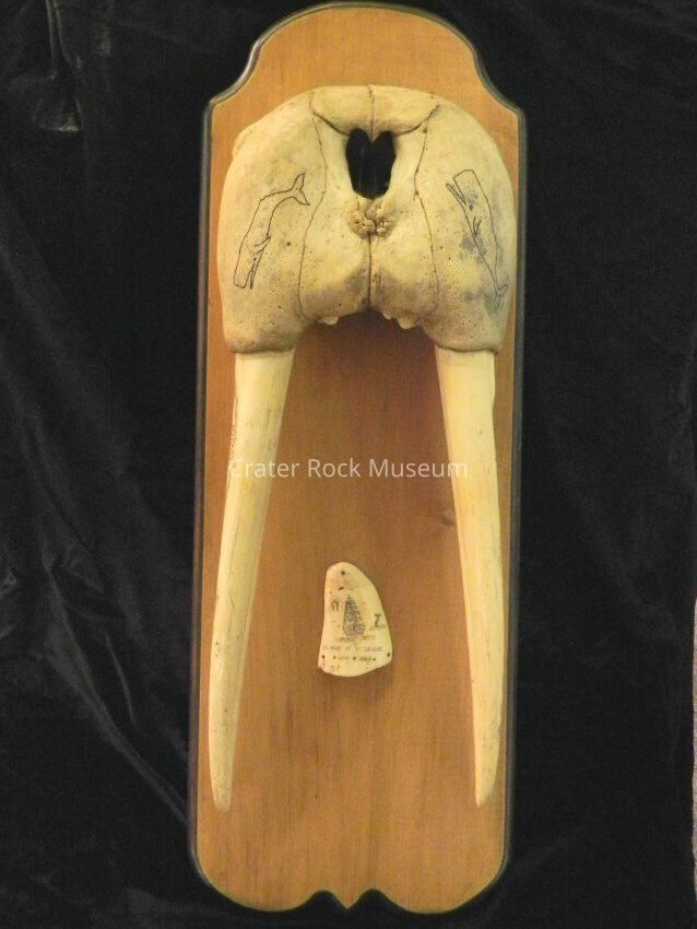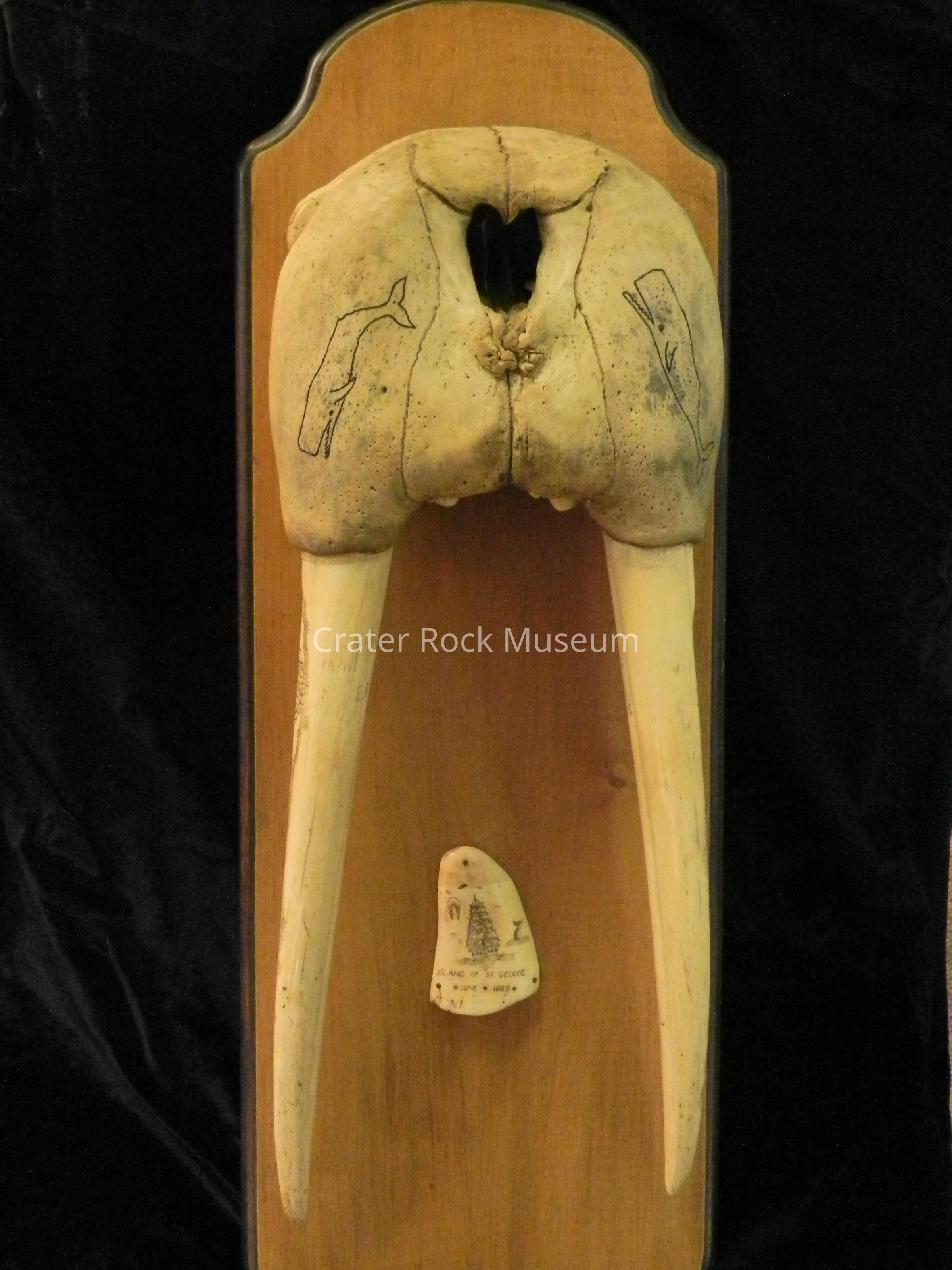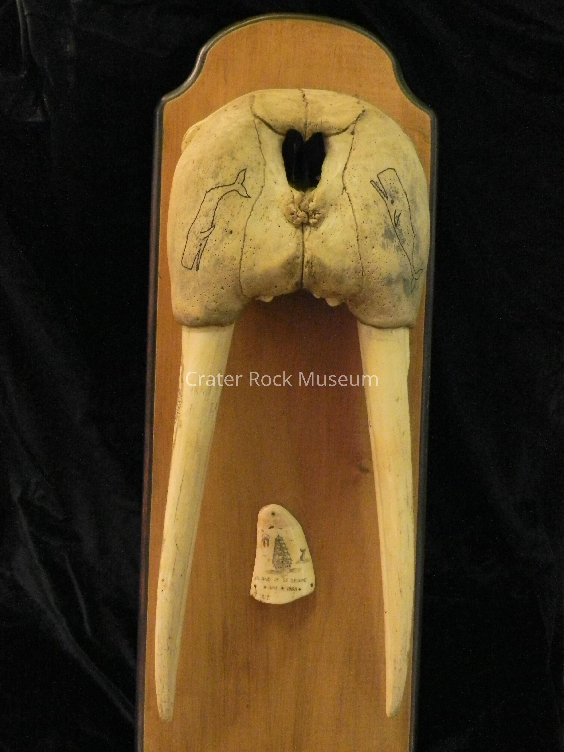 Description: Walrus skull with tusks, mounted on upper part of wood plaque. An etched piece of whale tooth is mounted in the center of the plaque. There are multiple etchings on the skull and tusks: two sperm whales on the skull, and multiple ships on each tusk. Plaque: 28 x 10 x 0.75 inches. Skull: 21.5 x 8.25 x 4.5 inches.