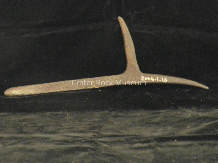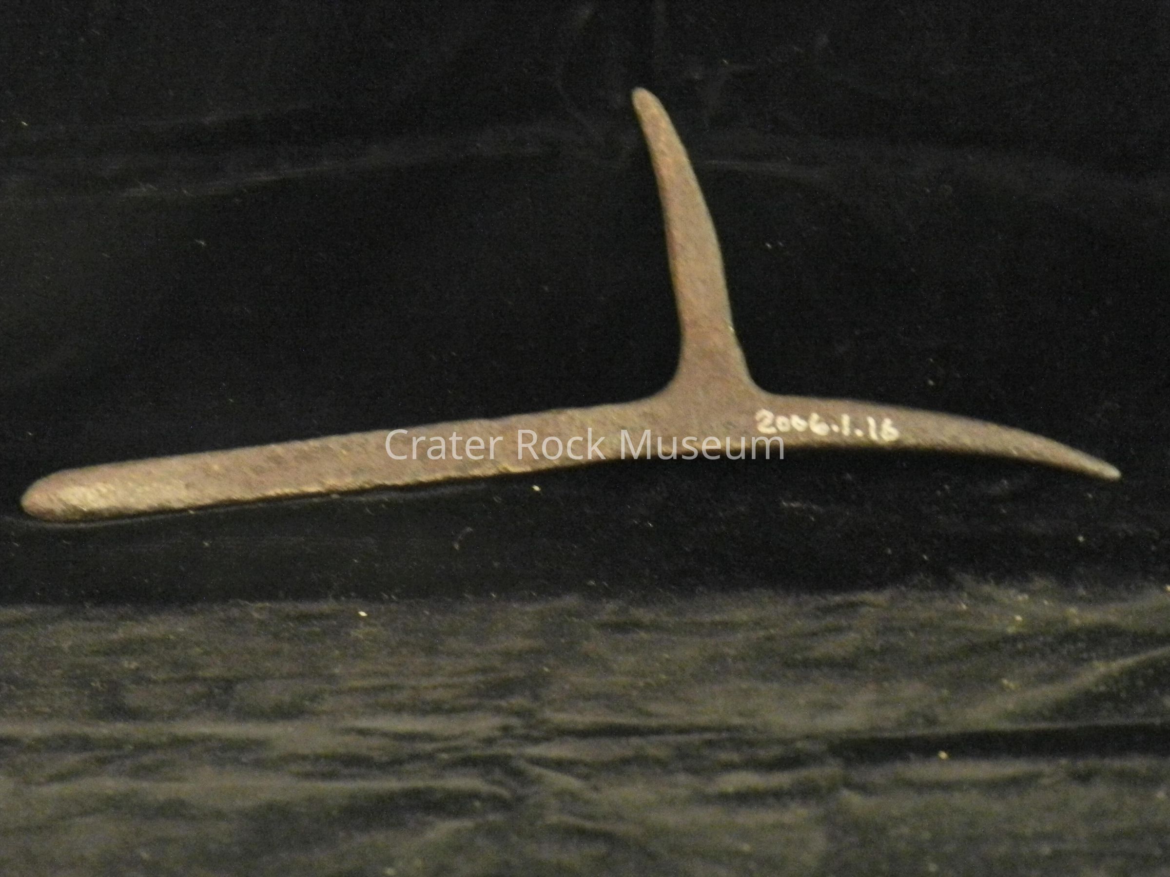Description: Harpoon tip, used for hunting whales. Tip has a 90 degree barb on one end. Forging is square in cross-section, with one pointed end.