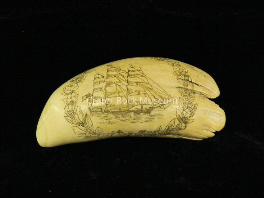 Scrimshaw is the name given to handiwork created by whalers made from the byproducts of harvesting marine mammals. It is most commonly made out of the bones and teeth of sperm whales, the baleen of other whales, and the tusks of walruses. It takes the form of elaborate engravings in the form of pictures and lettering on the surface of the bone or tooth, with the engraving highlighted using a pigment, or, less often, small sculptures made from the same material. However the latter really fall into the categories of ivory carving, for all carved teeth and tusks, or bone carving. The making of scrimshaw began on whaling ships between 1745 to 1759 on the Pacific Ocean, and survived until the ban on commercial whaling. The practice survives as a hobby and as a trade for commercial artisans. A maker of scrimshaw is known as a scrimshander.[1] Scrimshaw is also a surname. The etymology is uncertain, but there have been several proposals.[2]Collection