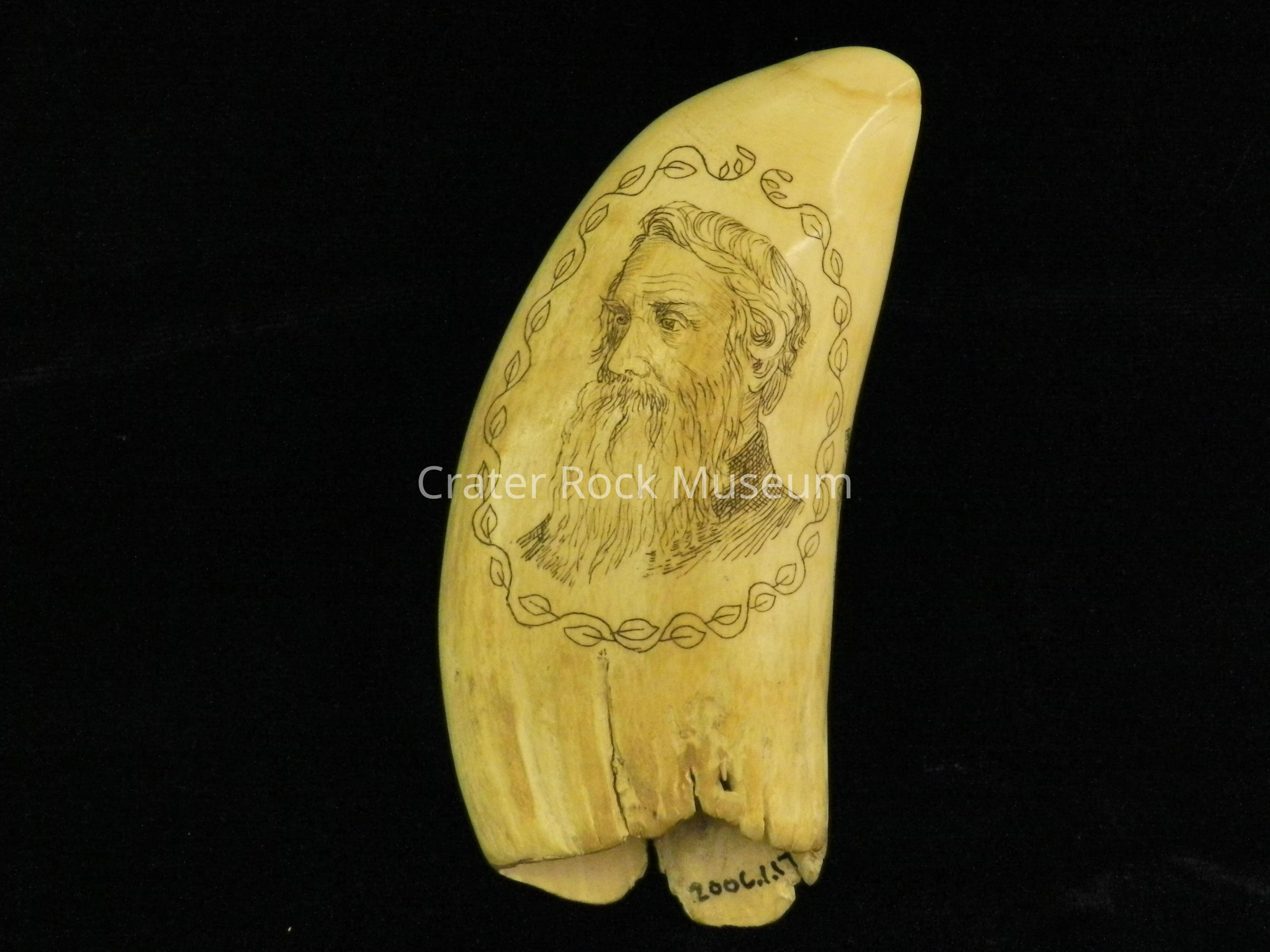 Description: Sperm whale tooth, with etching on two sides. One side shows a three-masted schooner surrounded by a floral motif. The other side has a bearded man's face surrounded by a single floral design.
