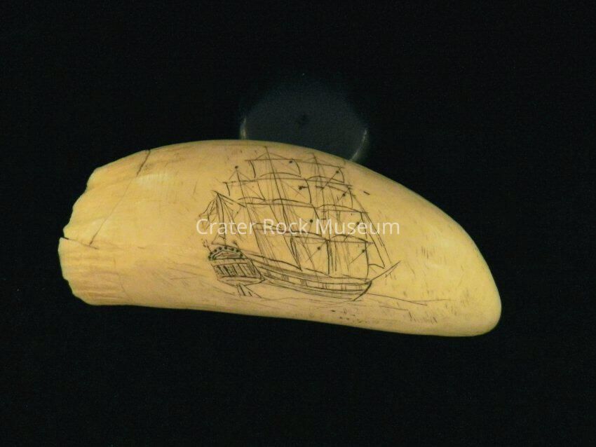 Description: Sperm whale tooth, with one etched side. The etched side shows a three-masted schooner.