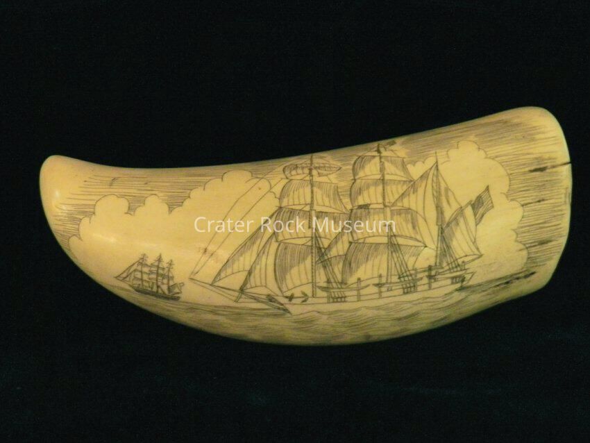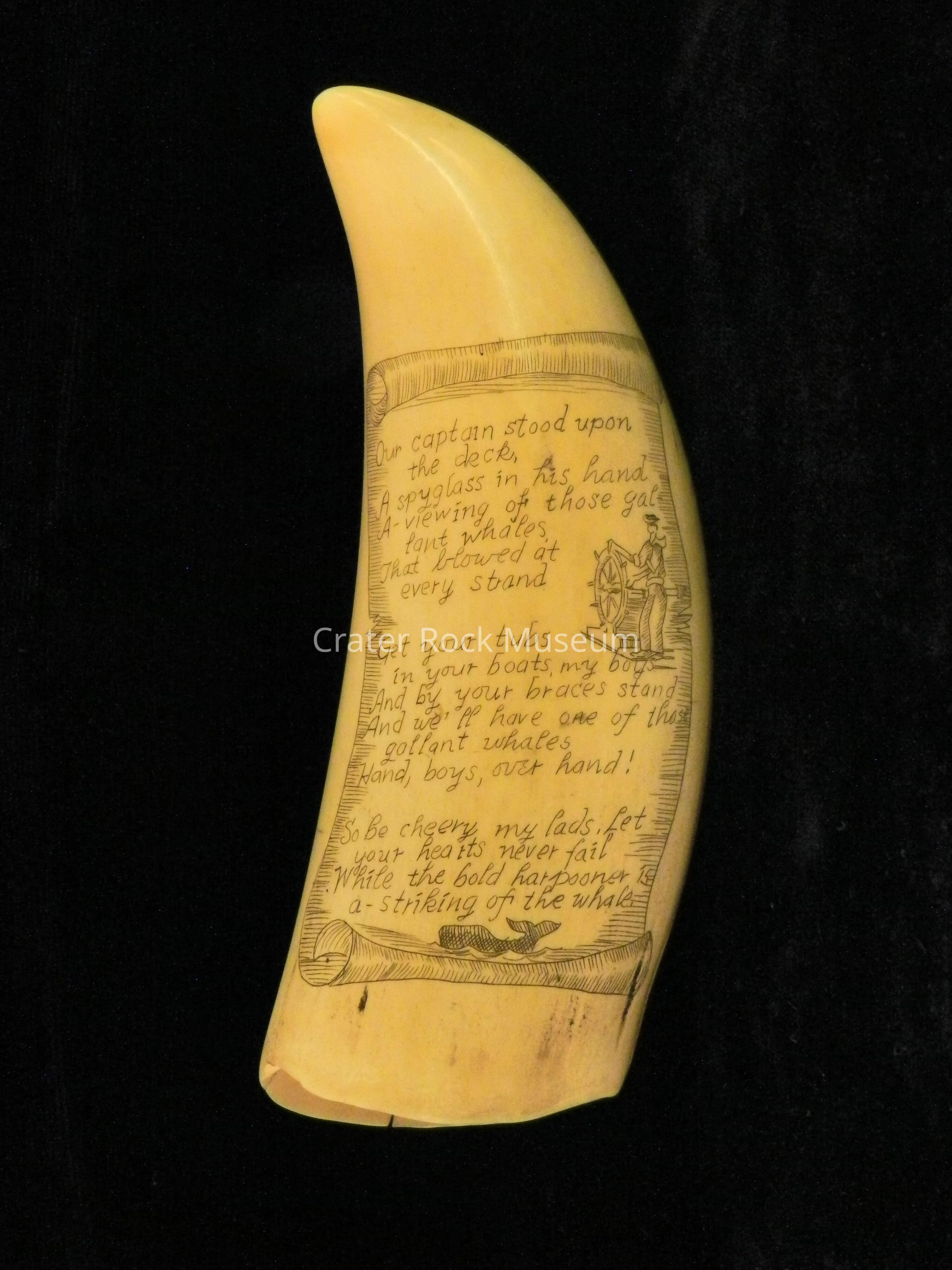 Description: Sperm whale tooth, etched on two sides. One side shows two three-masted schooners, one in the background and one in the foreground. The other side shows a lengthy poem depicted on a scroll parchment.