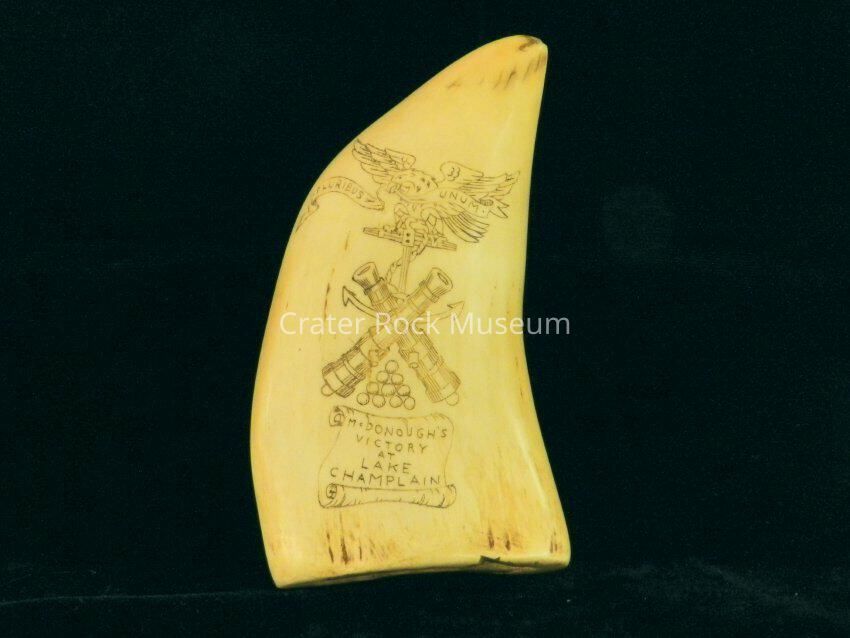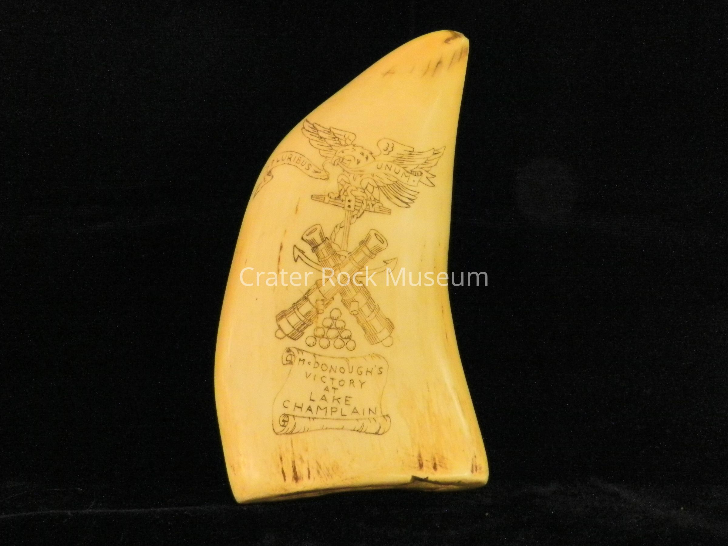 Description: Sperm whale tooth, etched on two sides. One side shows two three-masted ships (facing bow to bow) and 'ghost ships' in the clouds, enclosed within a rectangular border. The other side shows an eagle clutching an anchor, and two crossed cannons below with a shot pile. At bottom, a scroll reads "McDonough's Victory at Lake Champlain".