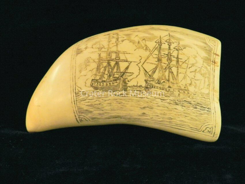 Scrimshaw is the name given to handiwork created by whalers made from the byproducts of harvesting marine mammals. It is most commonly made out of the bones and teeth of sperm whales, the baleen of other whales, and the tusks of walruses. It takes the form of elaborate engravings in the form of pictures and lettering on the surface of the bone or tooth, with the engraving highlighted using a pigment, or, less often, small sculptures made from the same material. However the latter really fall into the categories of ivory carving, for all carved teeth and tusks, or bone carving. The making of scrimshaw began on whaling ships between 1745 to 1759 on the Pacific Ocean, and survived until the ban on commercial whaling. The practice survives as a hobby and as a trade for commercial artisans. A maker of scrimshaw is known as a scrimshander.[1] Scrimshaw is also a surname. The etymology is uncertain, but there have been several proposals.[2]Collection