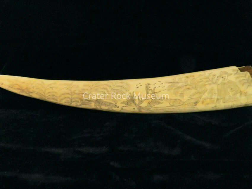 Scrimshaw is the name given to handiwork created by whalers made from the byproducts of harvesting marine mammals. It is most commonly made out of the bones and teeth of sperm whales, the baleen of other whales, and the tusks of walruses. It takes the form of elaborate engravings in the form of pictures and lettering on the surface of the bone or tooth, with the engraving highlighted using a pigment, or, less often, small sculptures made from the same material. However the latter really fall into the categories of ivory carving, for all carved teeth and tusks, or bone carving. The making of scrimshaw began on whaling ships between 1745 to 1759 on the Pacific Ocean, and survived until the ban on commercial whaling. The practice survives as a hobby and as a trade for commercial artisans. A maker of scrimshaw is known as a scrimshander.[1] Scrimshaw is also a surname. The etymology is uncertain, but there have been several proposals.[2]Collection