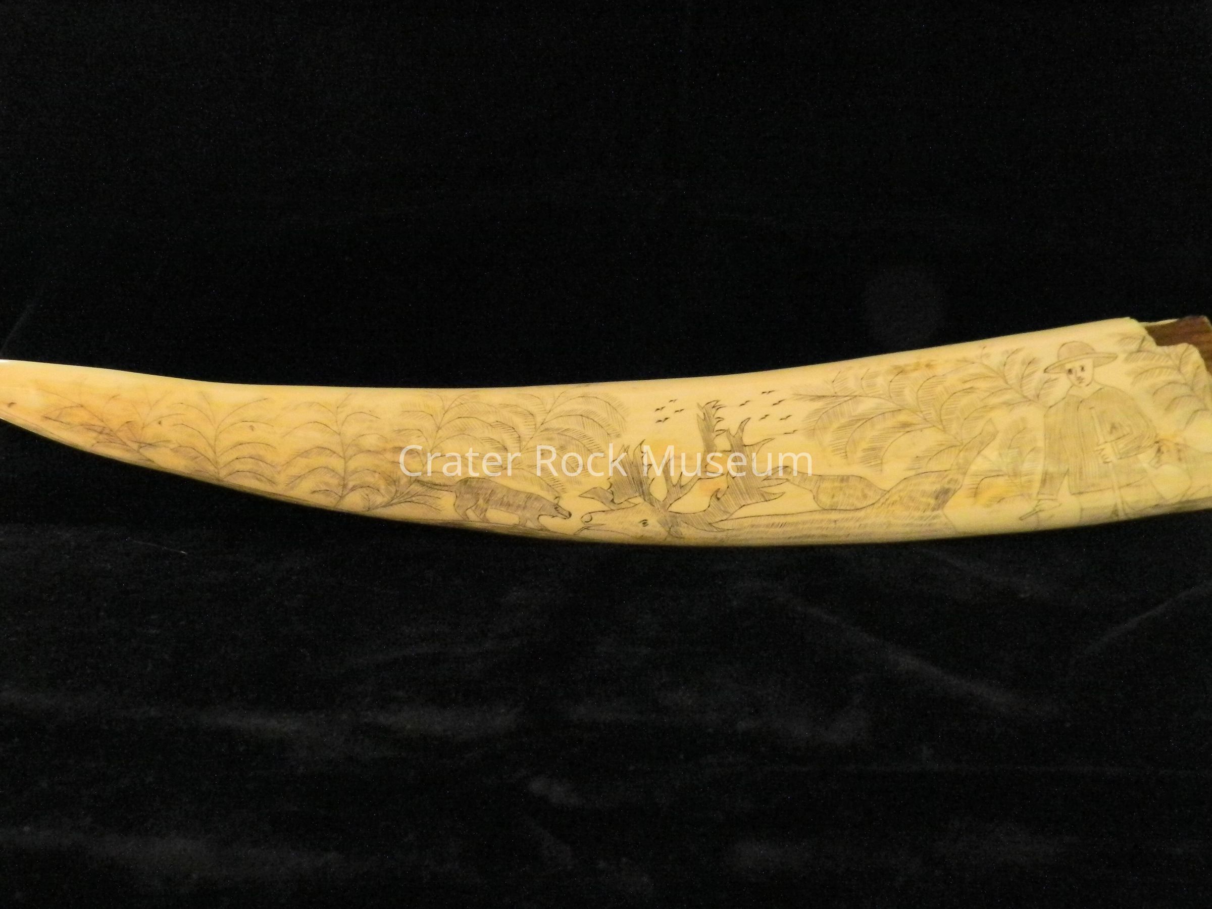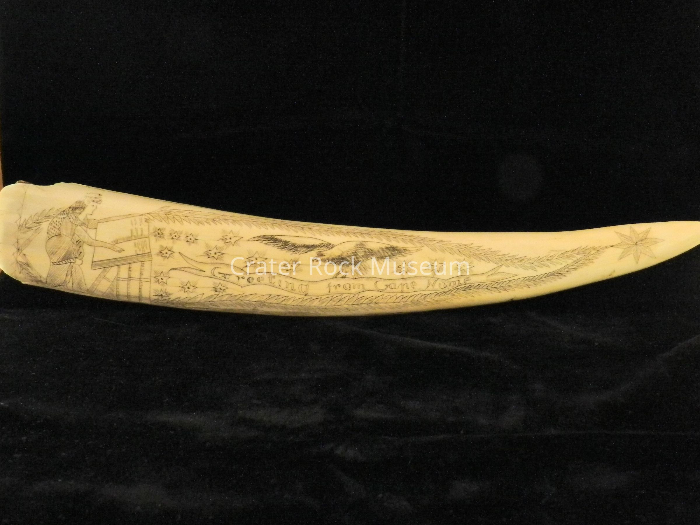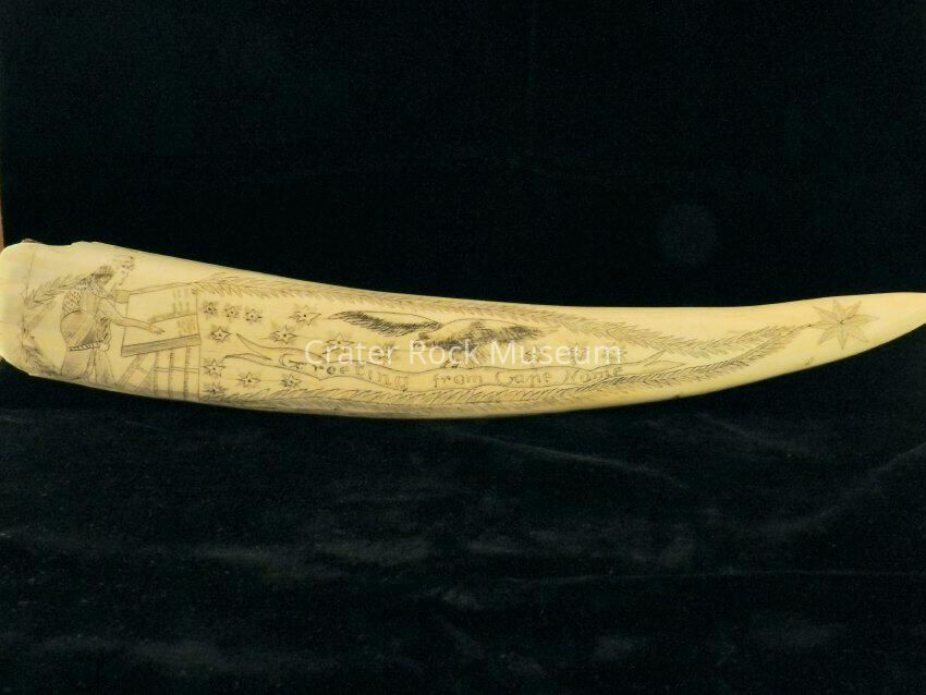 Description: Walrus tusk, etched on both sides. One side shows a woman on one end (with a book) and a long, streaming garland on the outer edges. The inner area has stars and an eagle clutching a banner reading "Greetings from Cape Nome". The other side shows a man with a dog and a 'downed stag' with multiple tree branches (ferns?).