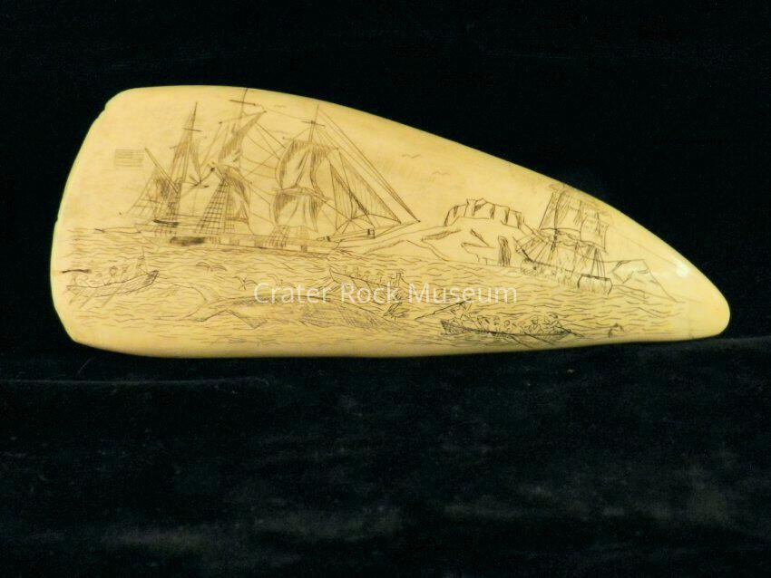 Scrimshaw is the name given to handiwork created by whalers made from the byproducts of harvesting marine mammals. It is most commonly made out of the bones and teeth of sperm whales, the baleen of other whales, and the tusks of walruses. It takes the form of elaborate engravings in the form of pictures and lettering on the surface of the bone or tooth, with the engraving highlighted using a pigment, or, less often, small sculptures made from the same material. However the latter really fall into the categories of ivory carving, for all carved teeth and tusks, or bone carving. The making of scrimshaw began on whaling ships between 1745 to 1759 on the Pacific Ocean, and survived until the ban on commercial whaling. The practice survives as a hobby and as a trade for commercial artisans. A maker of scrimshaw is known as a scrimshander.[1] Scrimshaw is also a surname. The etymology is uncertain, but there have been several proposals.[2]Collection