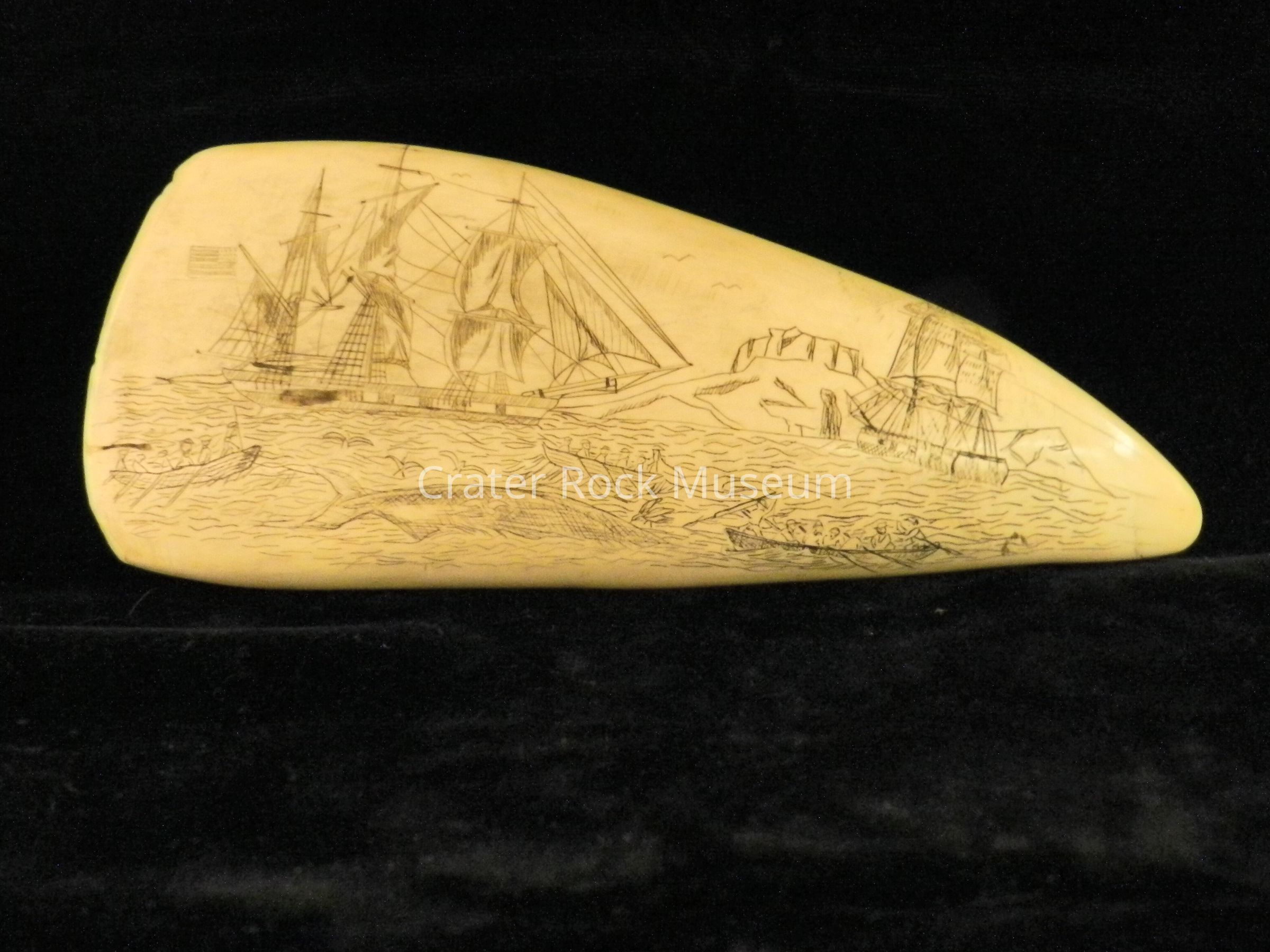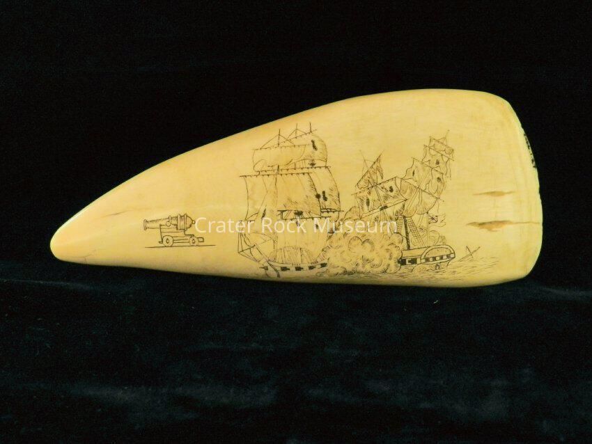 Description: Large sperm whale tooth, with etchings on two sides. One side shows two three-masted schooners, with three small whaling boats and one whale in the foreground (land in background). The opposite side shows two ships engaged in cannon fire, with an etching of a single cannon on wheels one one end.