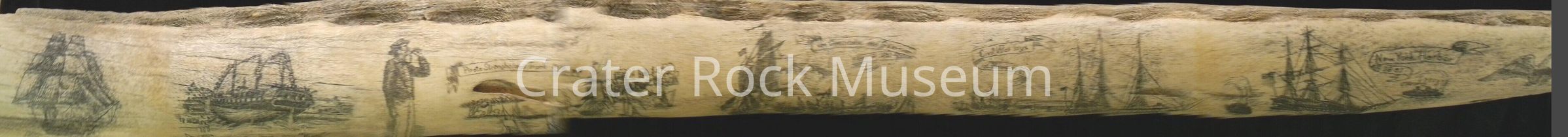 Description: Sperm whale 'jaw bone' with etchings on one side, illustrating significant events in the history of the frigate U.S.S. Constitution ('Old Ironsides') through 1881. From large end to small end, very fine etchings show front view of Constitution under full sail (including scudding sails), rear view of Constitution in drydock (Charlestown) with a banner reading "Boston Navy Yard - 1979", a sailor with a whistle (Bosun's Mate), Constitution in battle while sailing as flagship of the Mediterranean Squadron with a banner reading "Pirate Stronghold at Tripoli -1804", Constitution in battle with H.M.S. Guerriere with a banner reading "The Constitution and Guerrier - War of 1812", Constitution and unknown steamship with a banner reading "Civil War Days of Newport R.I.", Constitution and two tugs when she was placed out of commission with a banner reading "New York Harbor - 1881", and (last) an eagle with U.S. shield .