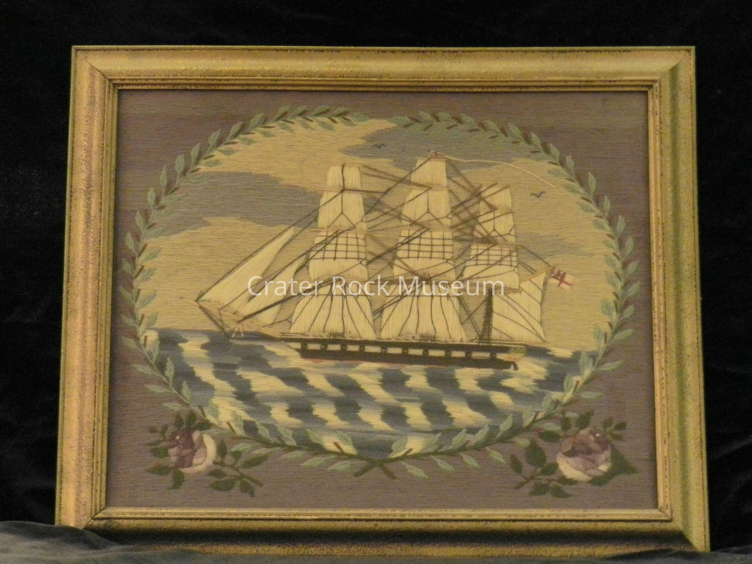 Description: Sailor's wool matte (picture in frame). Scene shows a three-masted ship with black hull in a floral patterned oval with lavender flowers at bottom corners.