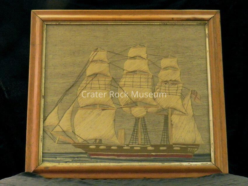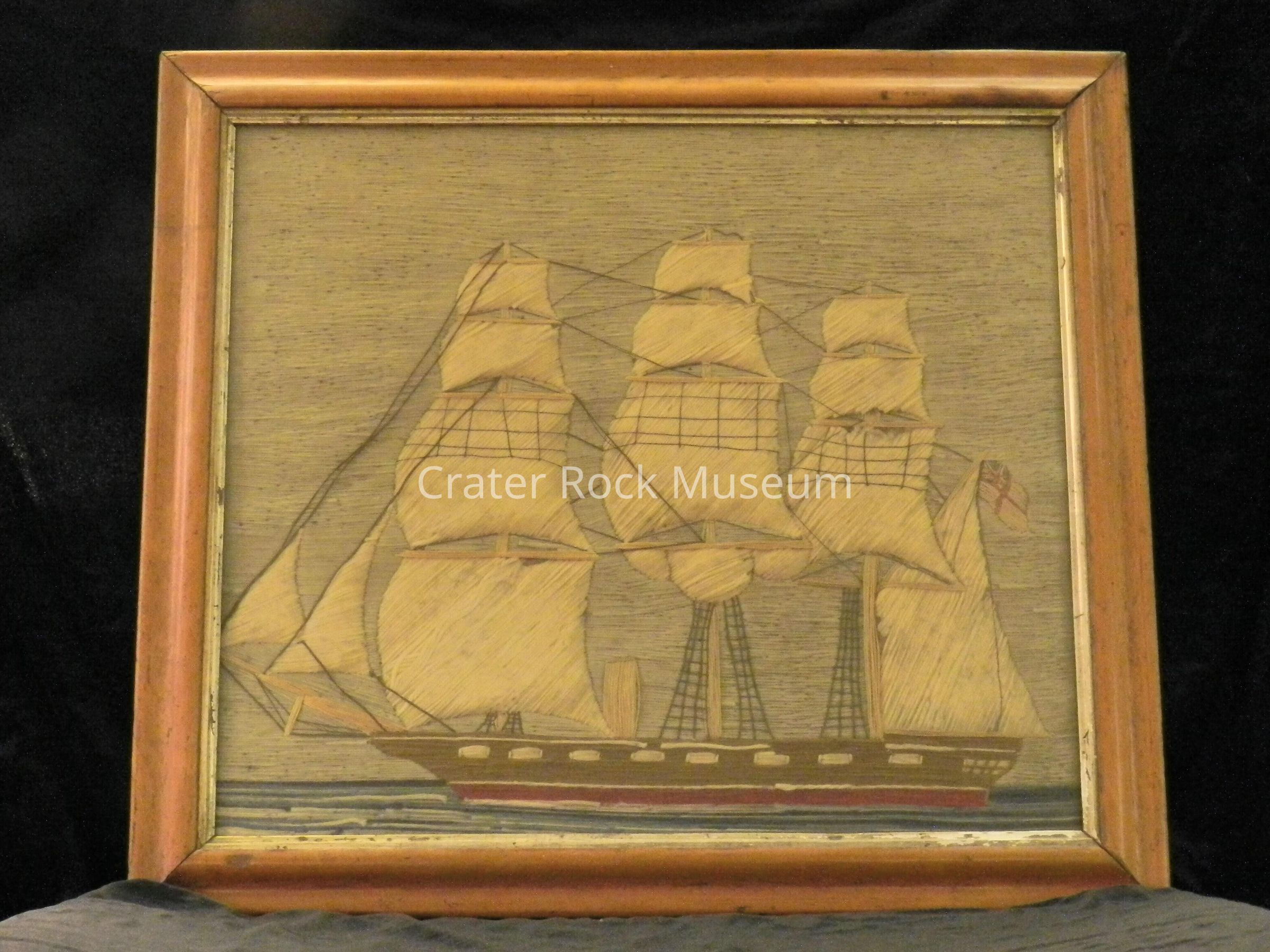 Description: Sailor's wool matte (picture in frame). Scene shows a three-masted ship filling most of the frame with brown & red hull, lime-green sky, and blue & white water (parallel lines).