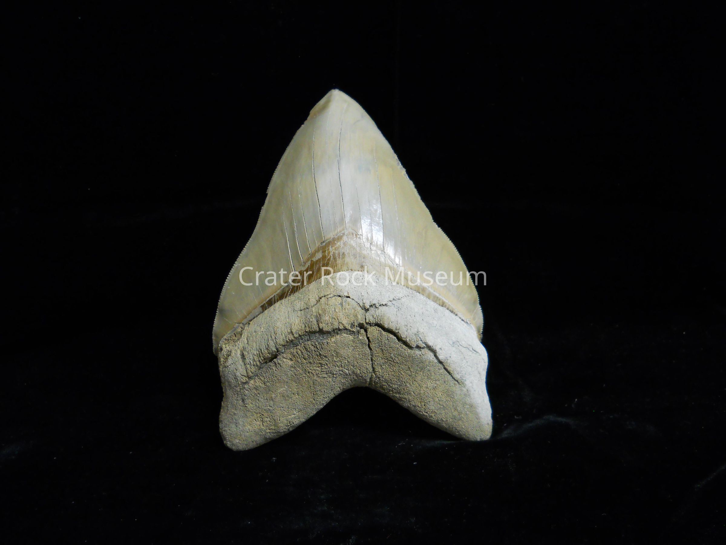 Description: This a well preserved specimen with some surface cracks on the tooth as well as the base. The serated edges are still very well preserved. The color is a creamy tan tooth with a sandy gray base.