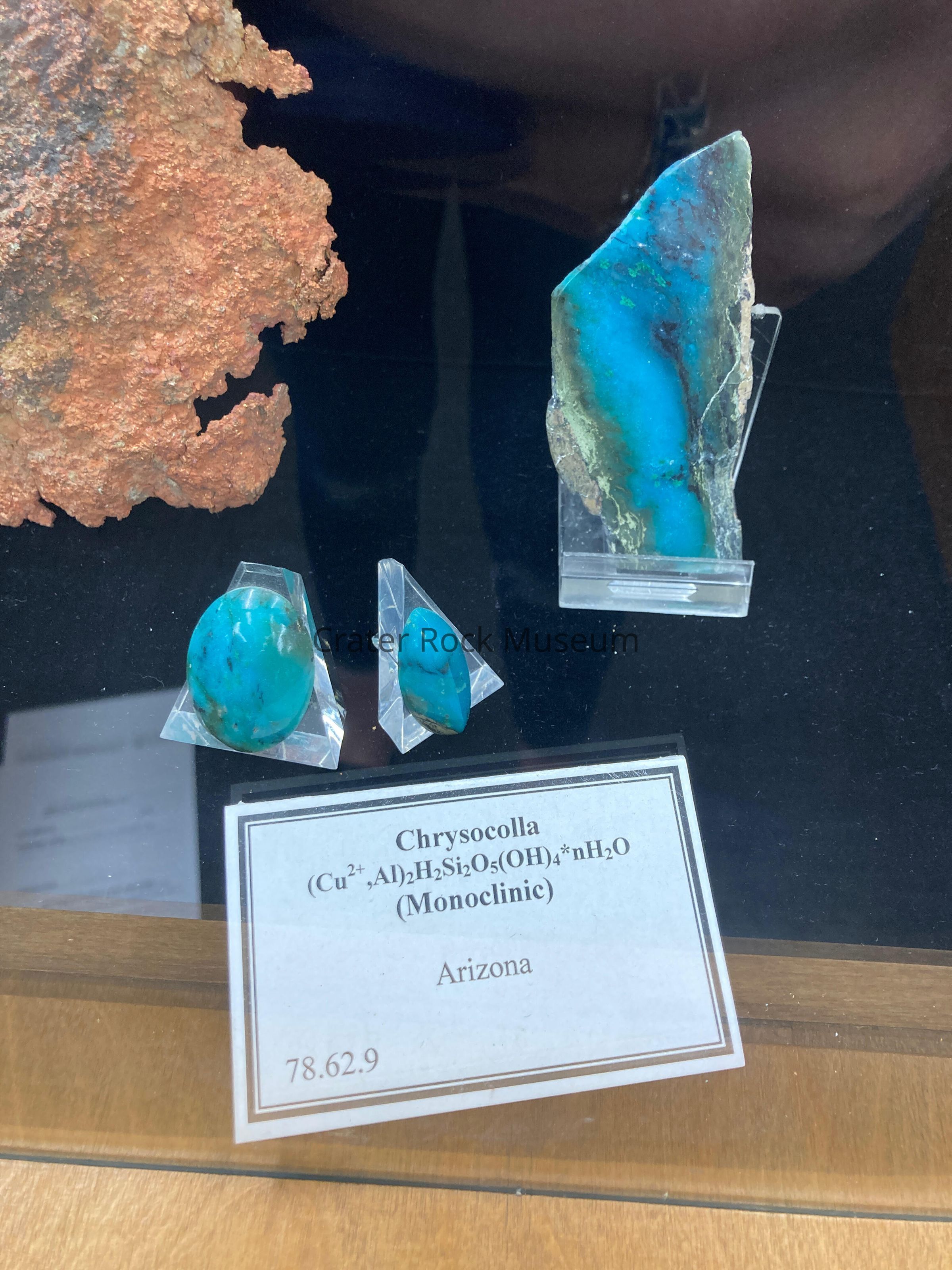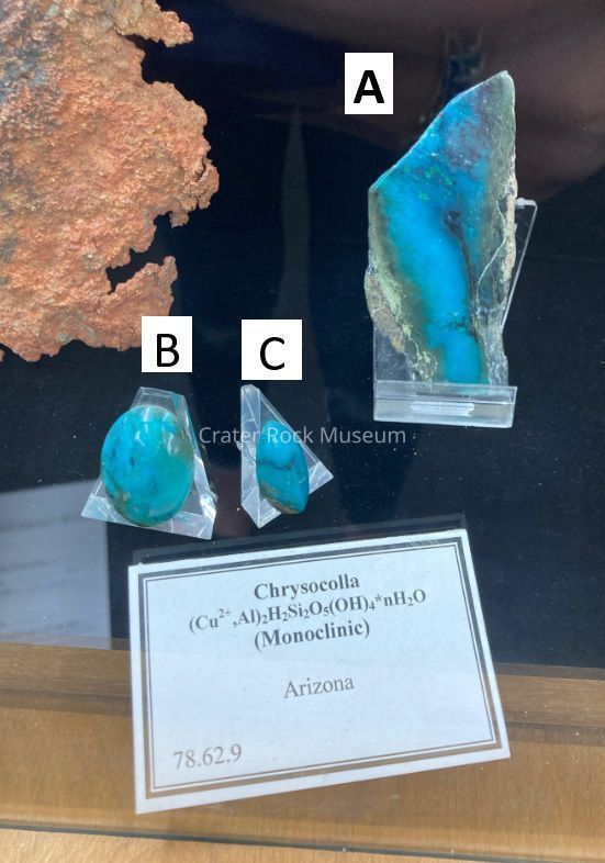 One piece of rectangular Chrysocolla and two small cabochons. An Electric Blue mineral, hydrous copper silicate. Found where copper minerals have been reached by groundwater solutions. Mixed with Quartz (silicon dioxide) to form mineral rock. Found in copper beds in AZ. Electric Blue, Green and Black.Acquisition