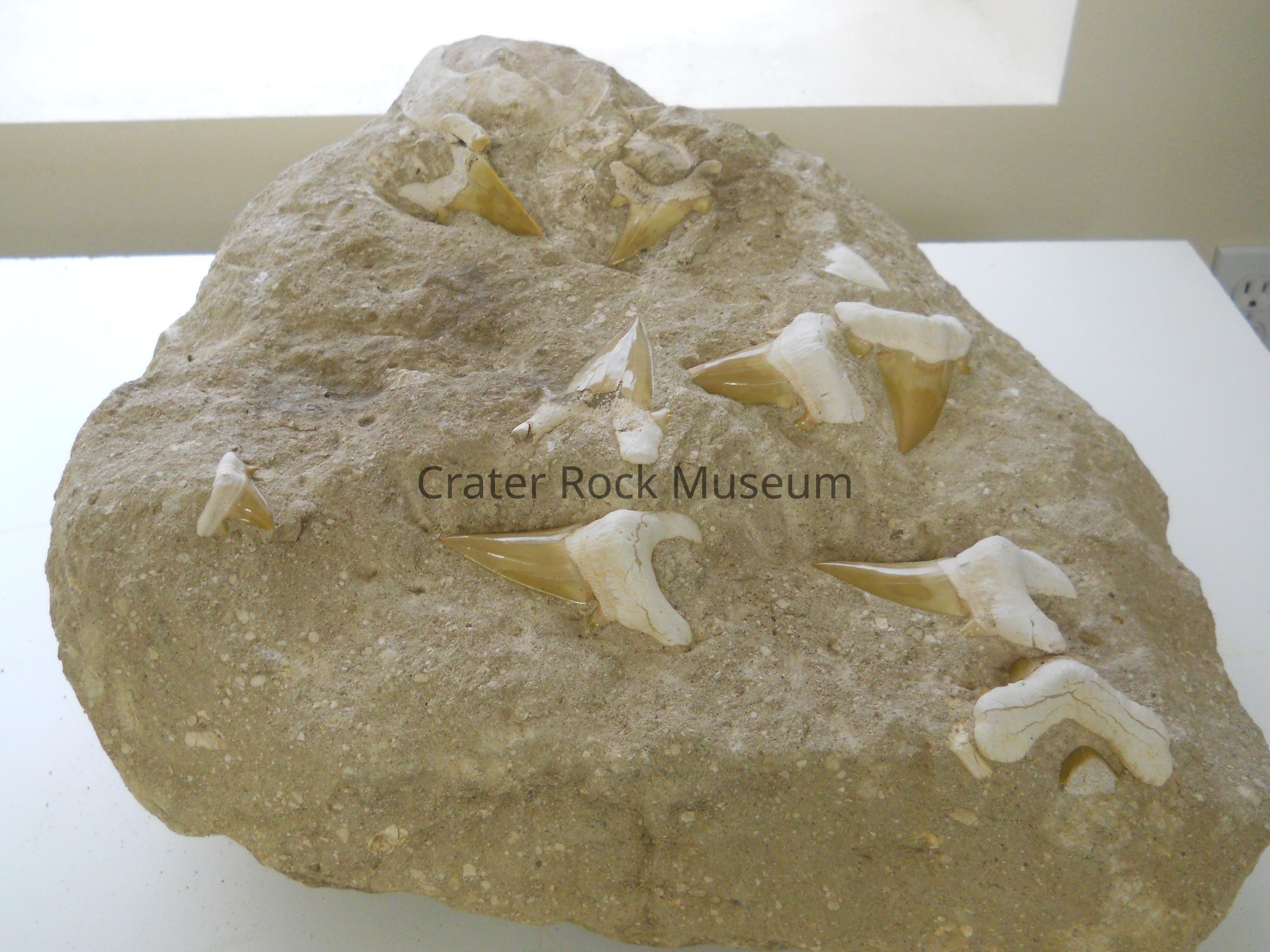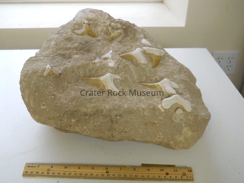 Description: This is a large block of a sandy matrix with at least nine (9) teeth visable. They are all well preserved in a random placement throughout the block.