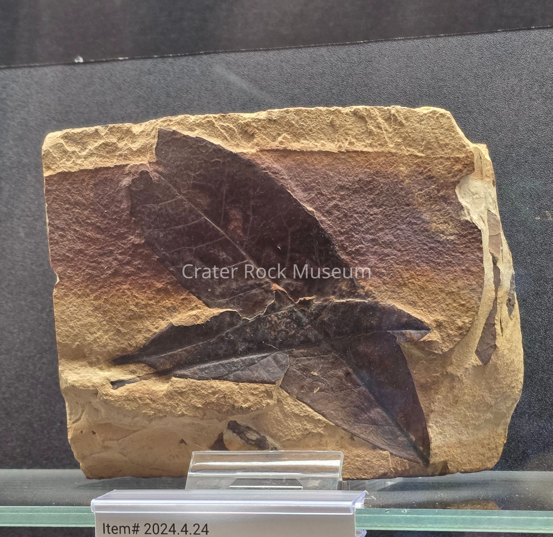 Multi colored ombre front slab with two overlapping leaves in a sandstone matrix. Sides show there are more fossilized flora in deeper layers.