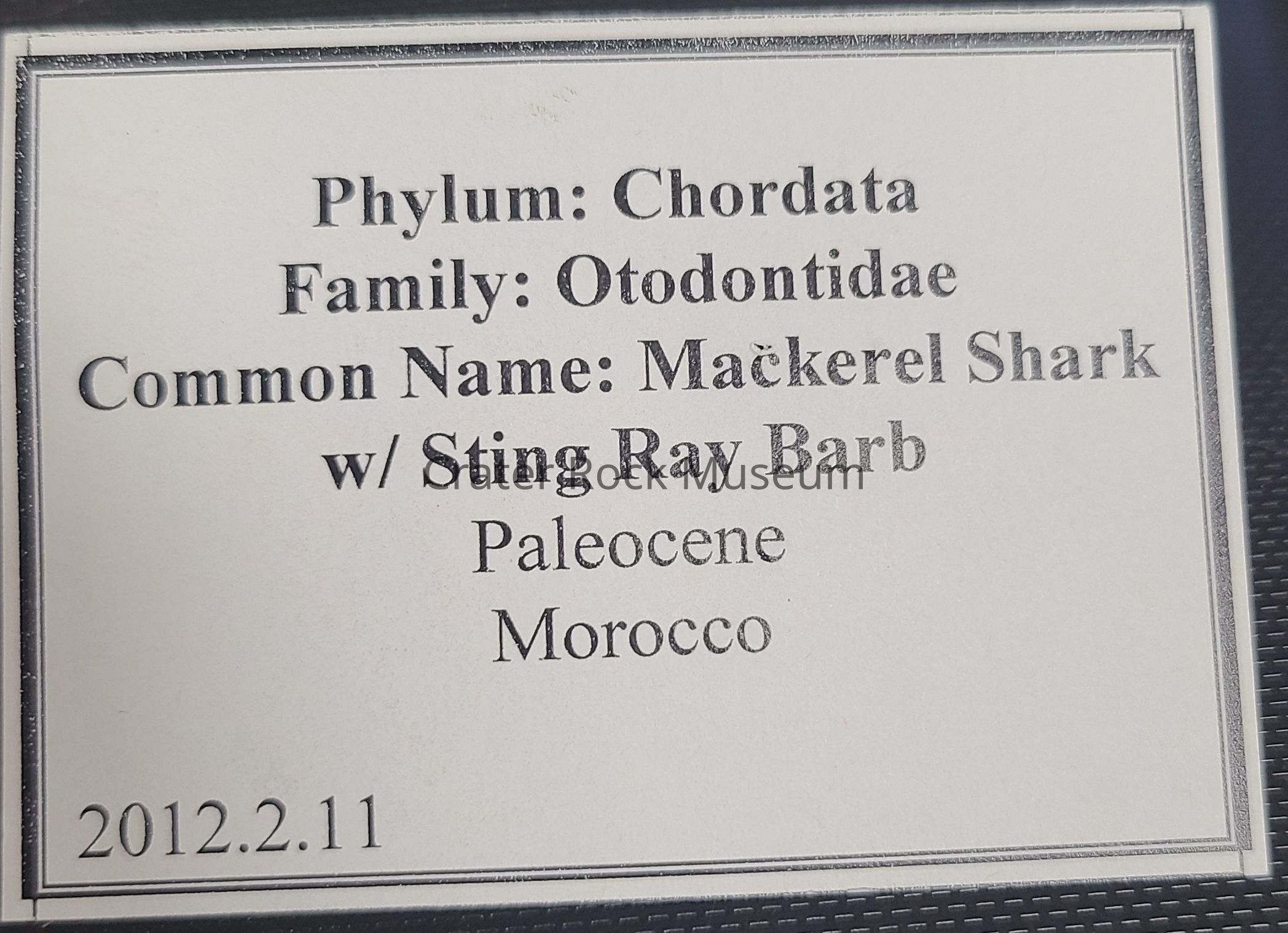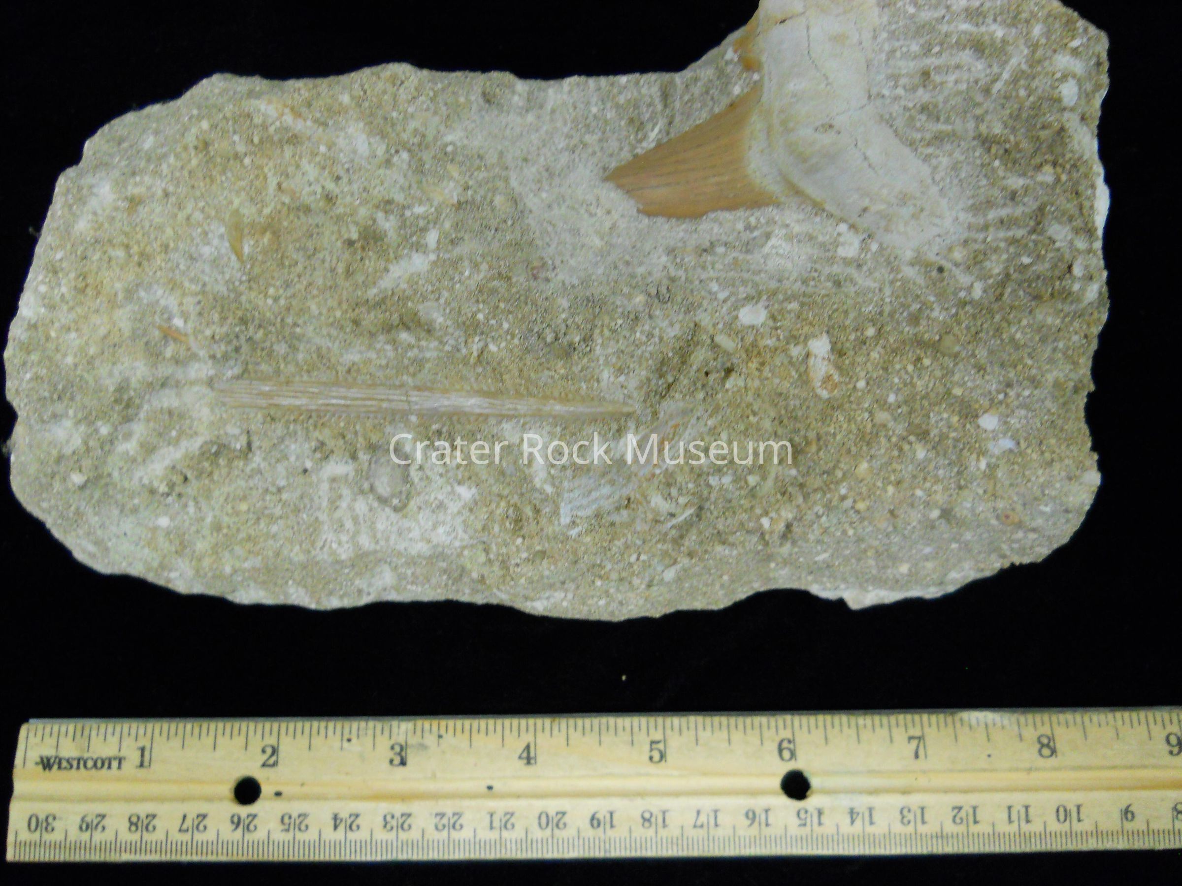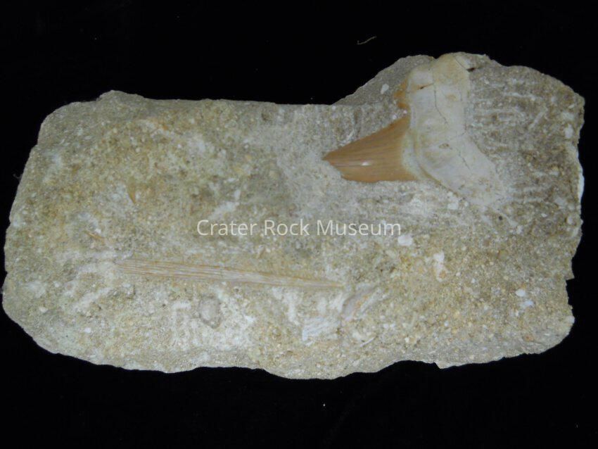 Description: This specimen has one shark tooth in a matrix with a Sting Ray barb visible